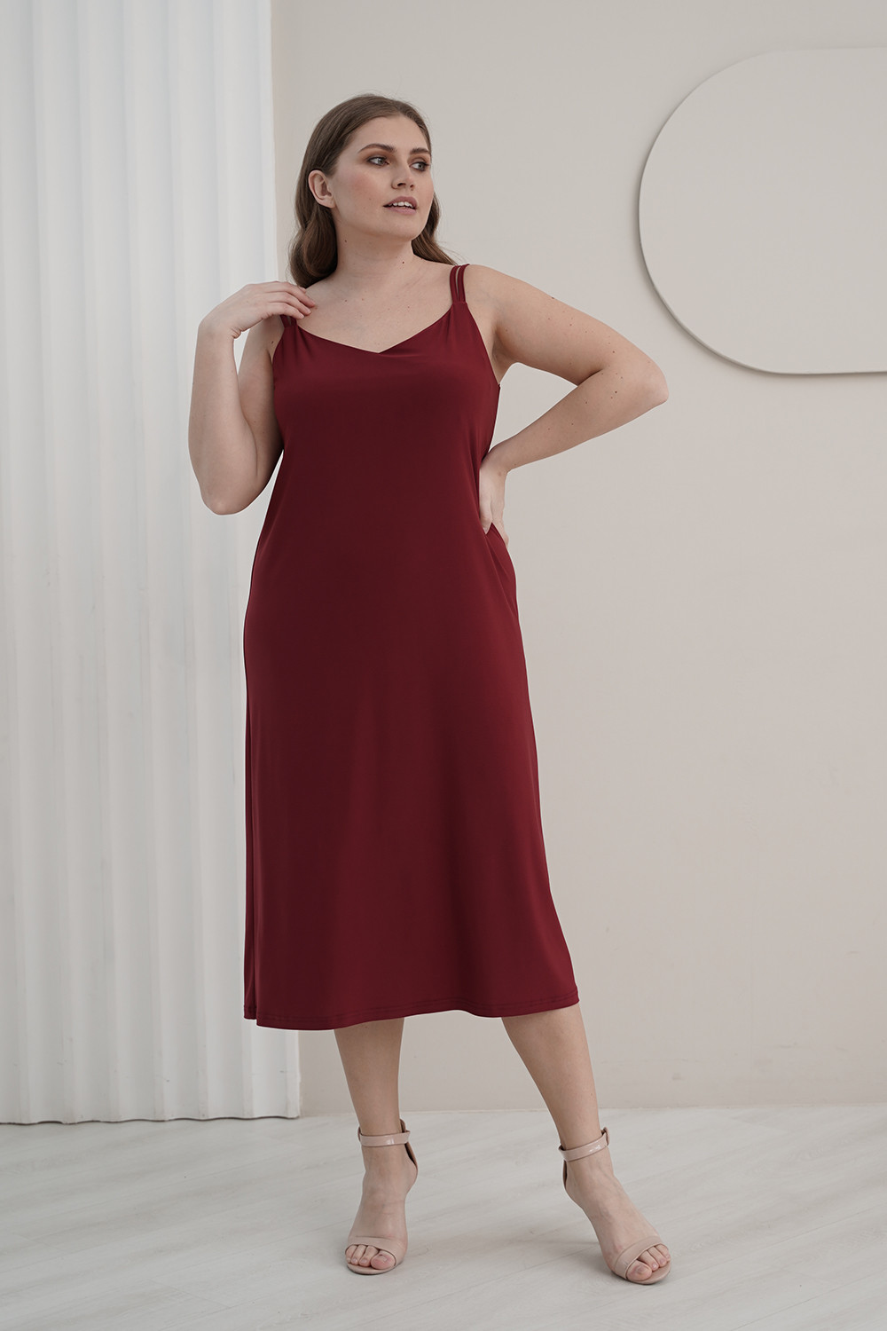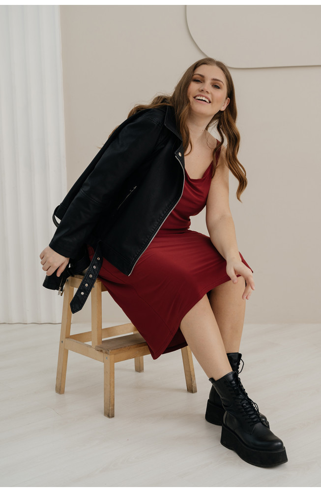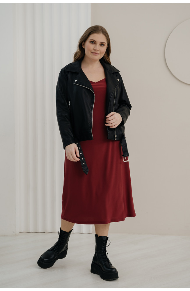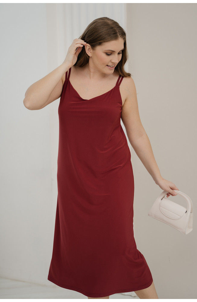 Описание: Сарафан из трикотажа "масло" А-образного силуэта на двойных тонких бретелях с V-образным вырезом декольте и длиной ниже колена.