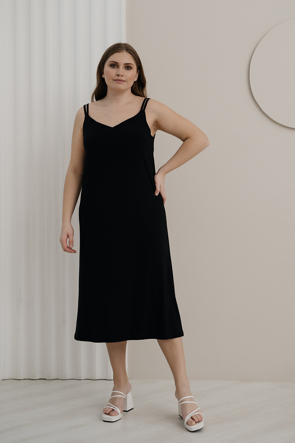 Описание: Сарафан из трикотажа "масло" А-образного силуэта на двойных тонких бретелях с V-образным вырезом декольте и длиной ниже колена.