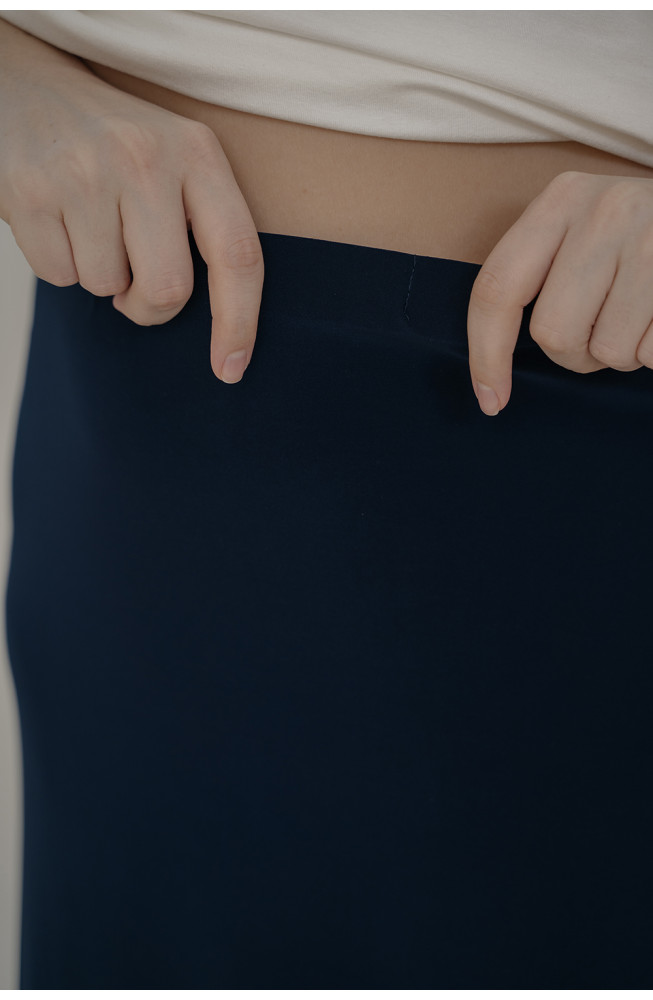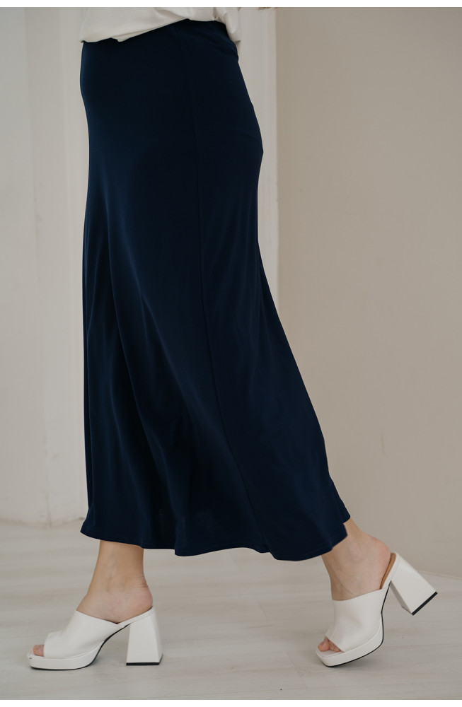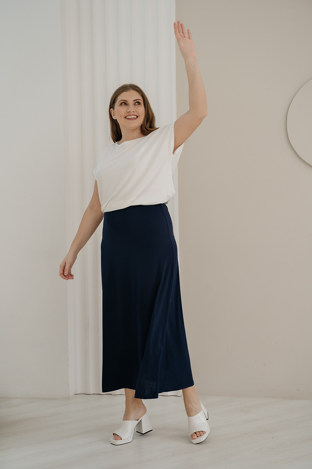 Юбка женская трапеция, длинная, в пол, умеренно расклешенная от бедра, без молнии, с высокой посадкой, на резинке, пришитой к верхнему краю юбки, подвернутой и зафиксированной в нескольких местах на поясе. Летящая юбка макси, однотонная, синяя (или черная) из приятного легкого струящегося трикотажного полотна «масло» или «холодок» прекрасно подойдет для летней погоды. Конструкция изделия обеспечивает комфортную посадку и подойдет ко всем типам фигур, в том числе большим размерам. Это женственная базовая универсальная юбка, которая позволит составить интересные образы для жизни в городе, для работы в офисе, для прогулок, для отдыха, в том числе на море в сочетании с блузками, топами, маечками и кардиганами.