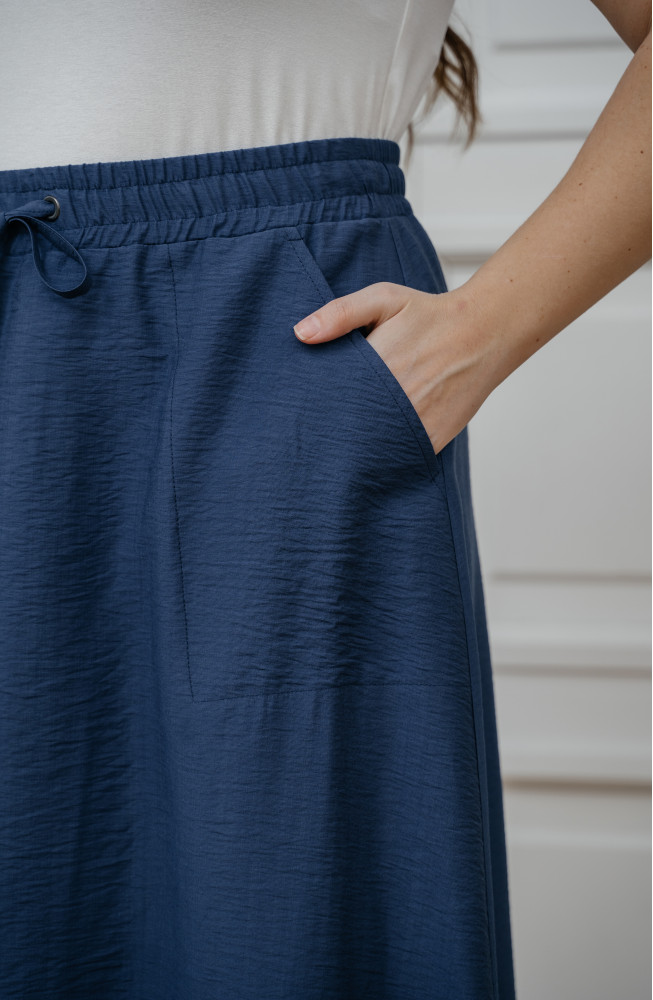 Описание: Юбка-клёш из вискозной ткани с жатым эффектом на поясе с резинкой и завязками по талии и с обьемными карманами. Юбка длиной до середины голени.