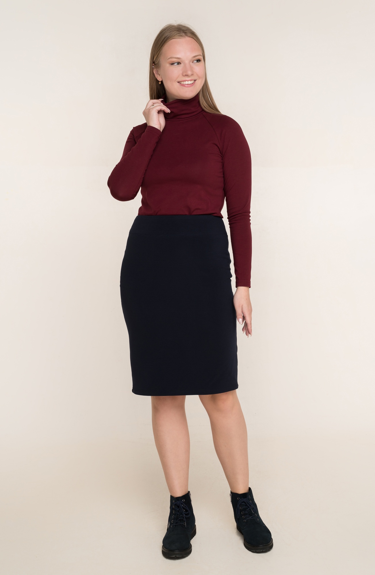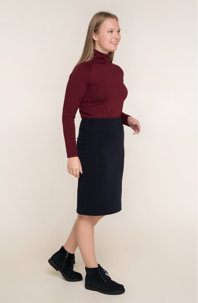 Описание: Юбка-карандаш из плотного трикотажа "рубчик" на поясе-кокетке с застежкой-молнией сзади, длиной за колено на подкладке.