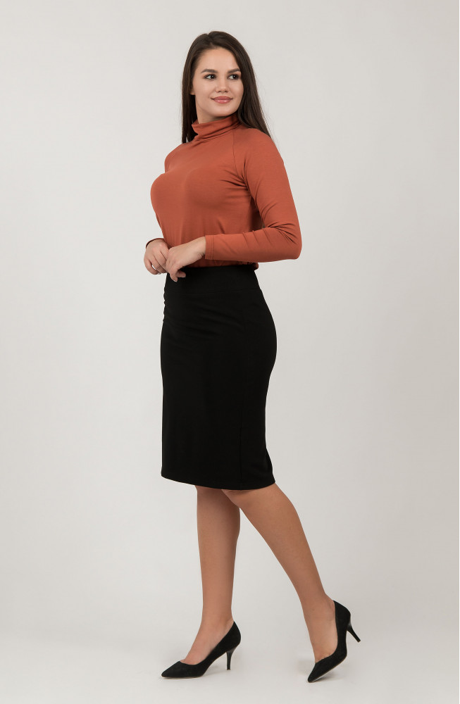Описание: Юбка-карандаш из плотного трикотажа "рубчик" на поясе-кокетке с застежкой-молнией сзади, длиной за колено на подкладке.