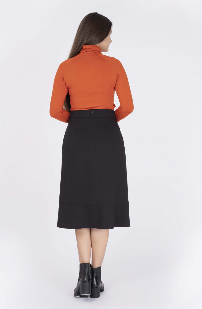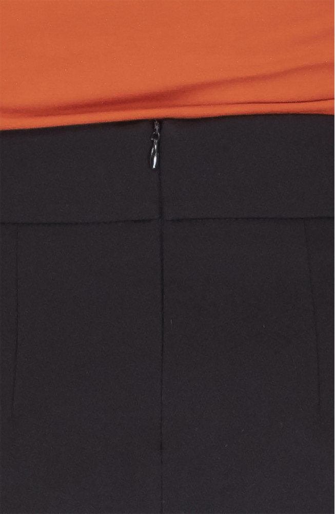 Описание: Юбка из костюмной ткани с небольшим клешением на поясе по талии с молнией сзади, карманами в боковых частях и широкой планкой по низу.