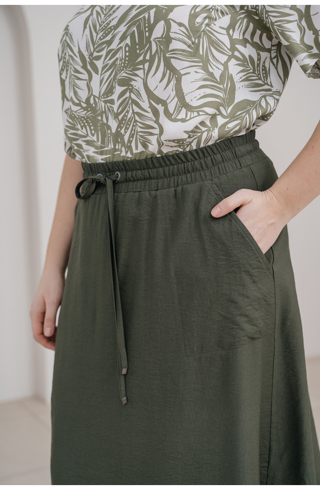 Описание: Юбка-клёш из вискозной ткани с жатым эффектом на поясе с резинкой и завязками по талии и с обьемными карманами. Юбка длиной до середины голени.