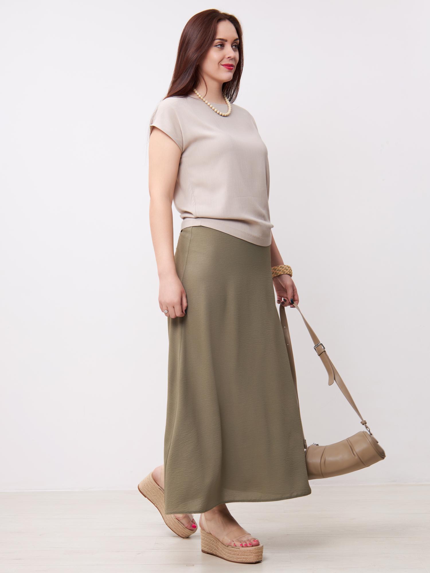 Летящая юбка макси выполнена из костюмной ткани с жатым эффектом, что придаёт ей особый шарм, делая образ легким. Она не мнется, что очень удобно для путешествий, поездок к морю и активного отдыха.