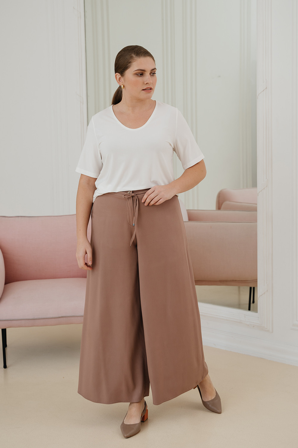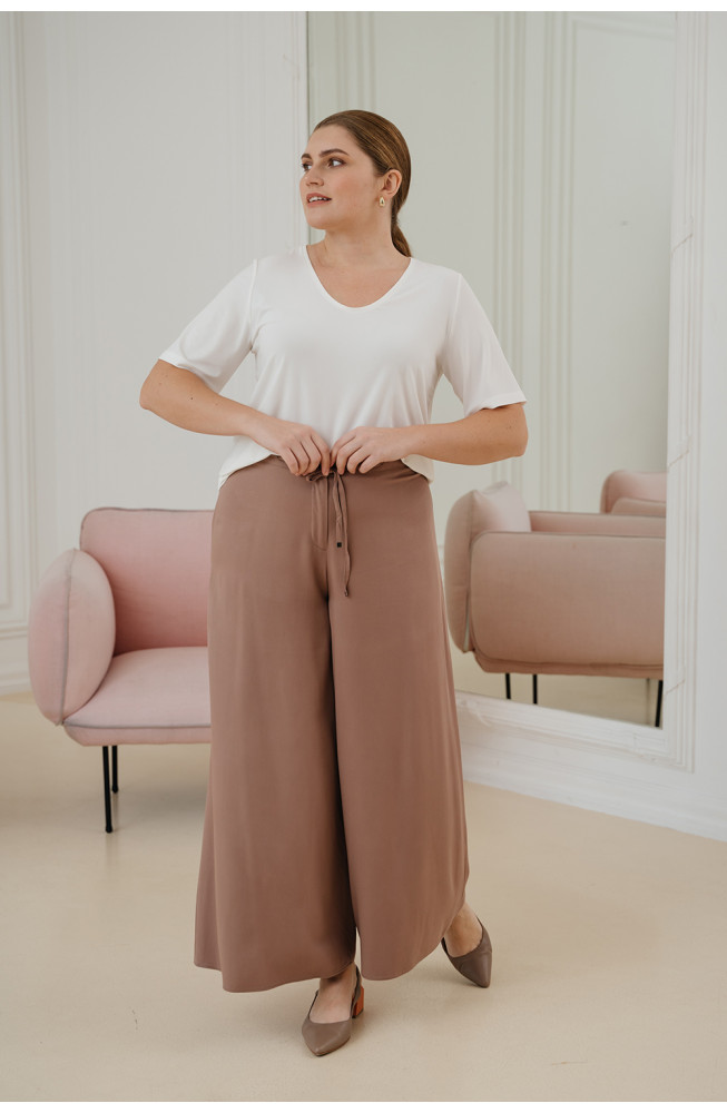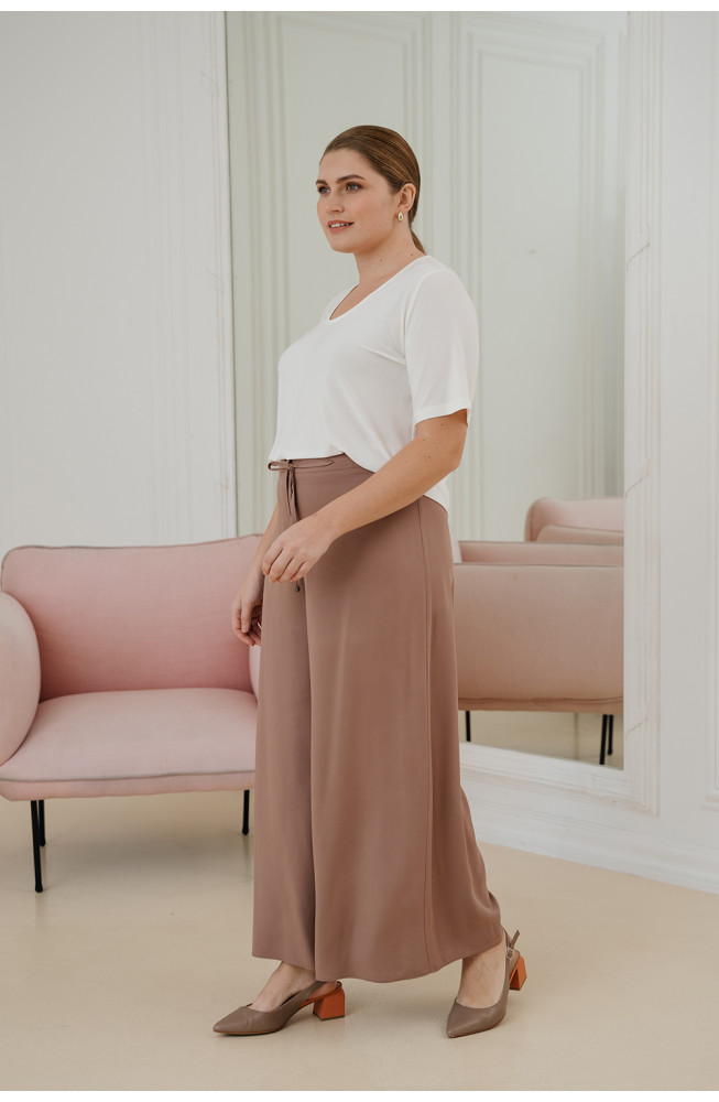 Описание: Легкие женские брюки незаменимы жарким летом; натуральная по составу, гладкая фактура полотна исключает трение ног между собой, в жару, это спасает женщин с пышными бедрами от необходимости носить летом длинные панталоны. Широкие брюки больших и маленьких размеров, с высокой посадкой, расклешенные от бедра, повседневные, длинные, из вискозного штапеля, на застежке-молнии спереди, с завязкой-шнурком по талии. Брюки типа палаццо - невесомые, нежные, будут особенно удобны на отдыхе, а также в городе, на прогулке, в путешествии. Завязка позволяет регулировать размер изделия по талии. По силуэту летние брюки в базовом цвете, хорошо сочетаются с блузками, рубашками, топами, майками и короткими кардиганами.