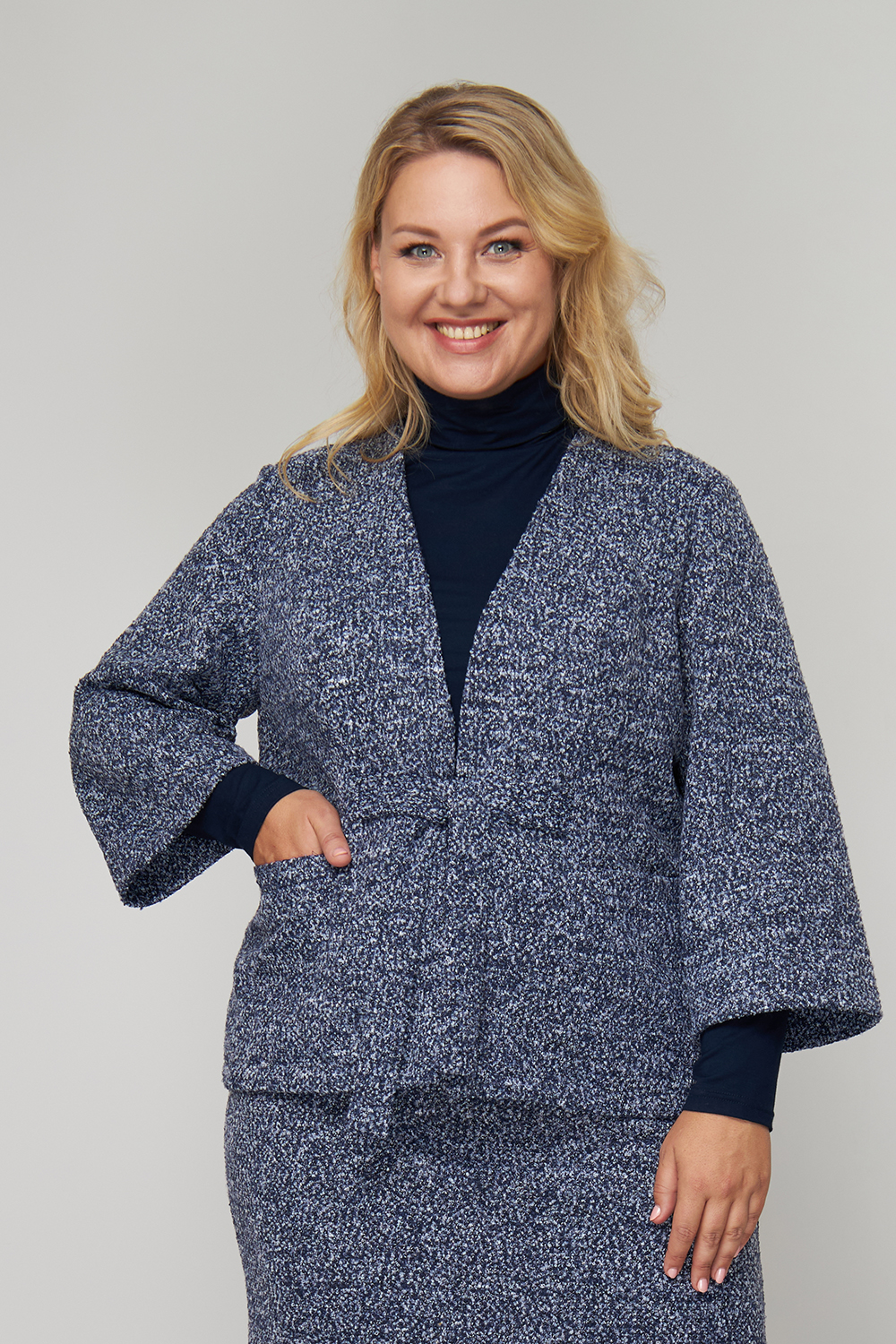 Описание: Жакет из из фактурного трикотажа "букле" полуприлегающего силуэта с V-образным вырезом горловины, карманами в боковых частях и на завязках по талии. Рукава расширенные 3/4.