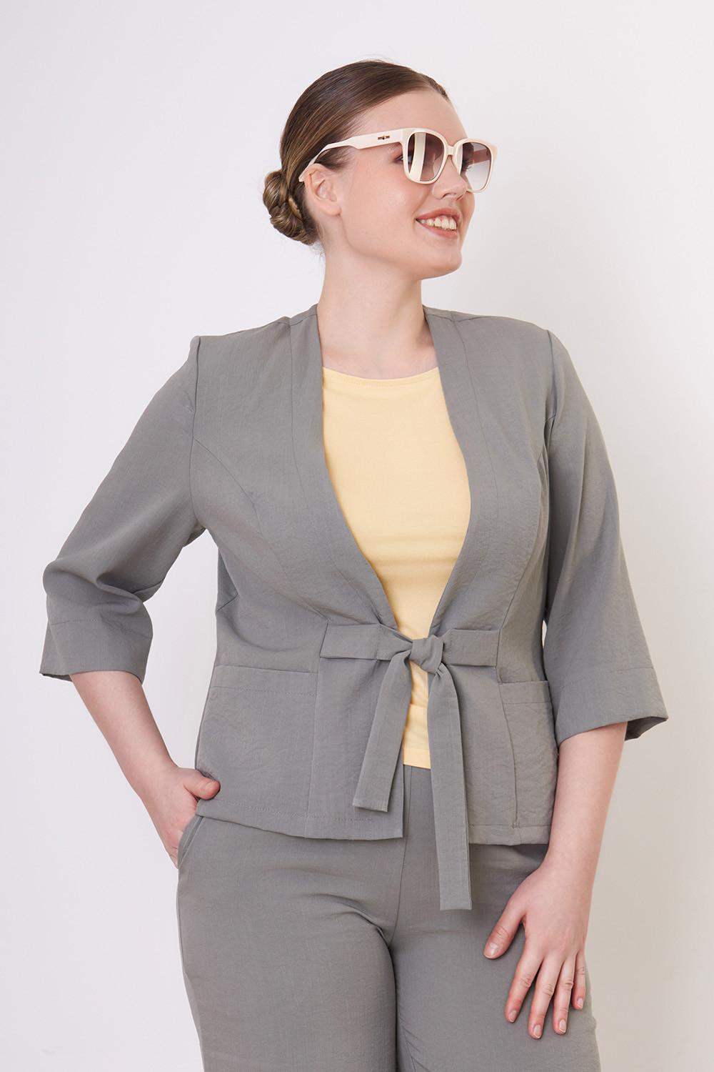Описание: Жакет из костюмной ткани с эффектом крэш полуприлегающего силуэта с V-образным вырезом горловины, карманами в боковых частях и на завязках по талии. Рукава расширенные 3/4.