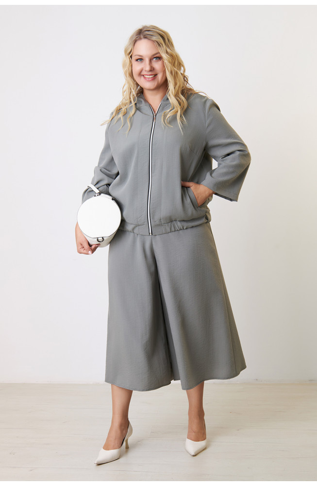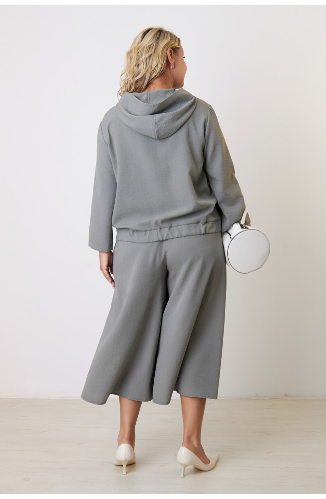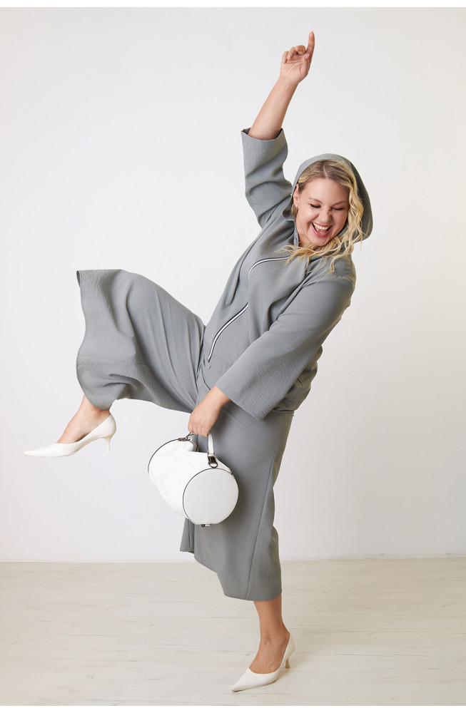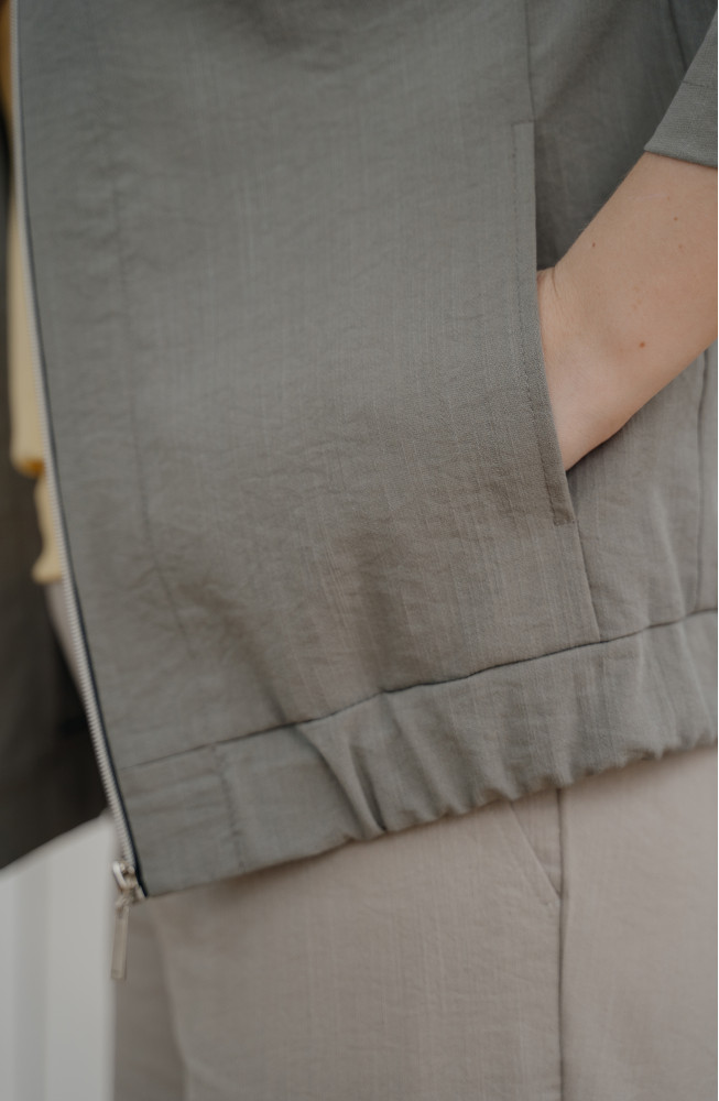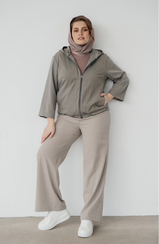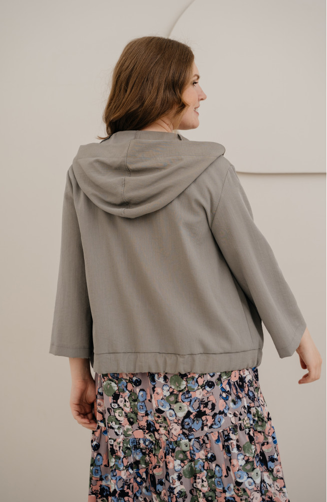 Описание: Жакет из плотной костюмной ткани с жатым эффектом прямого силуэта на молнии с капюшоном и широкими рукавами длиной 7/8.