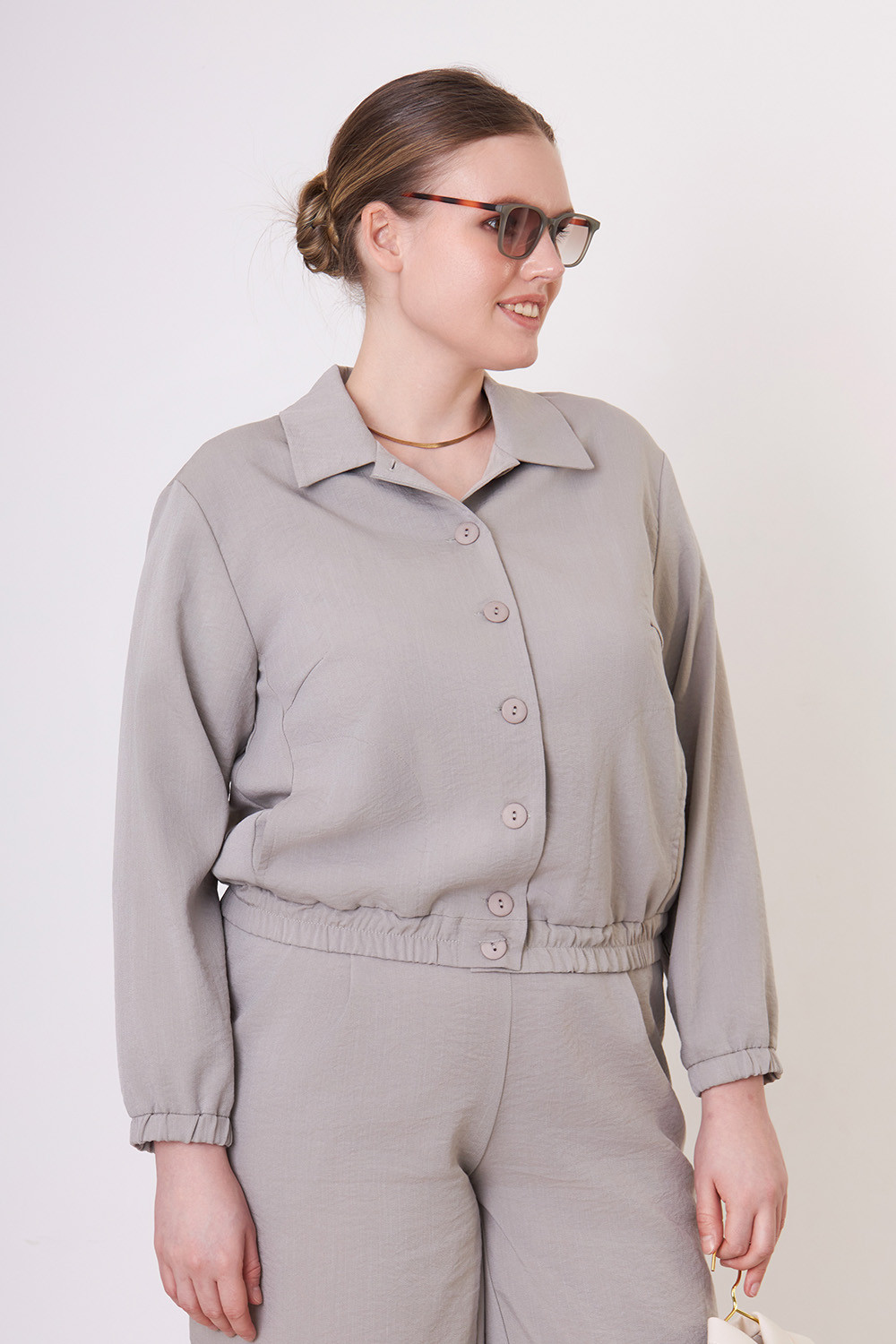 Облегченная куртка О-силуэта выполнена из костюмной ткани с жатым эффектом с отложным воротником и втачными рукавами до запястья.