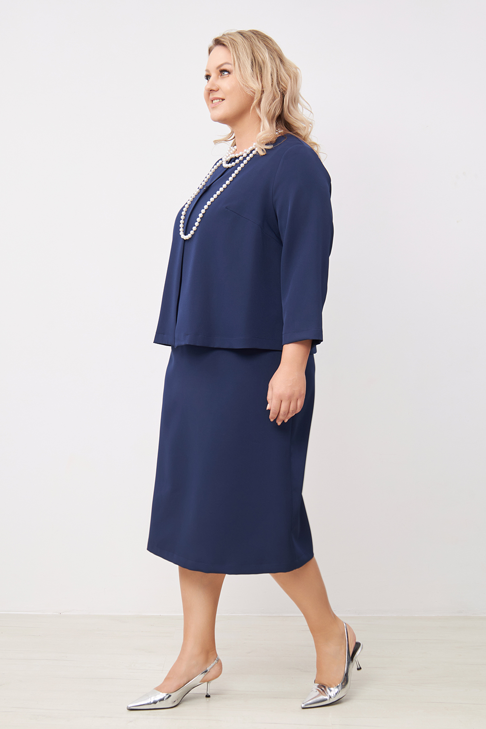 Жакет п/п силуэта, не много расширен к низу, юбочной длины, на 2х пуговицах с двушовными рукавами, длинной 3/4