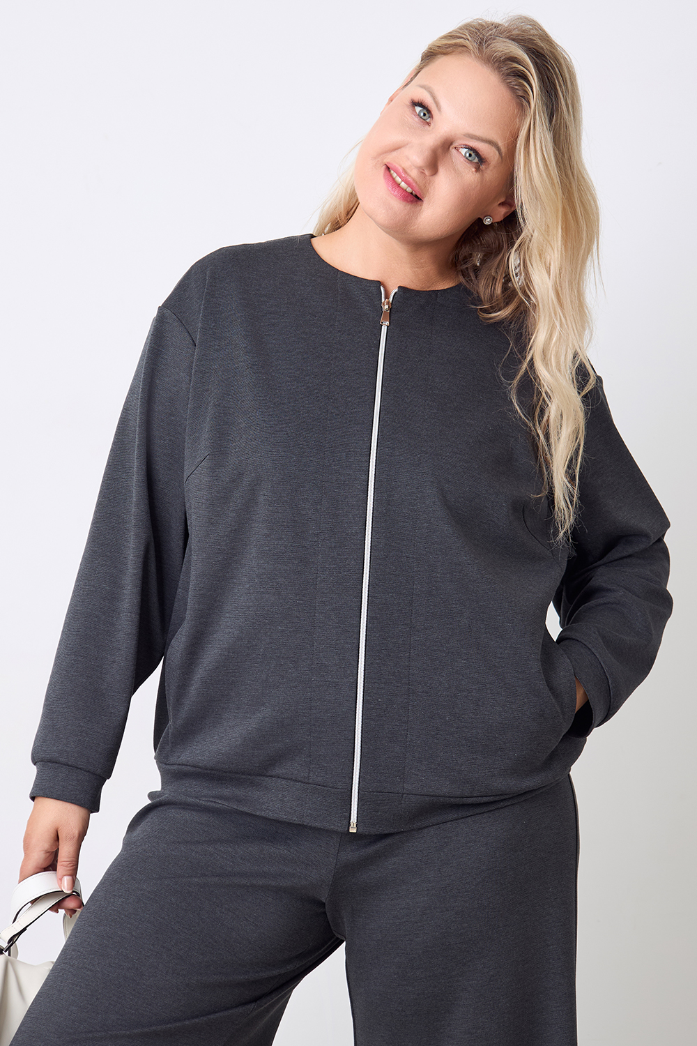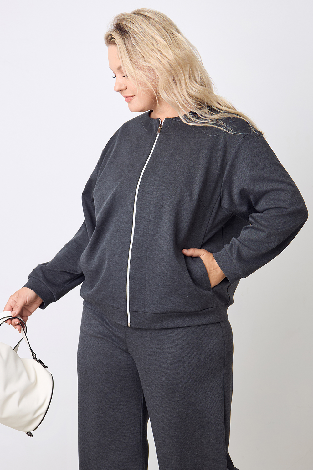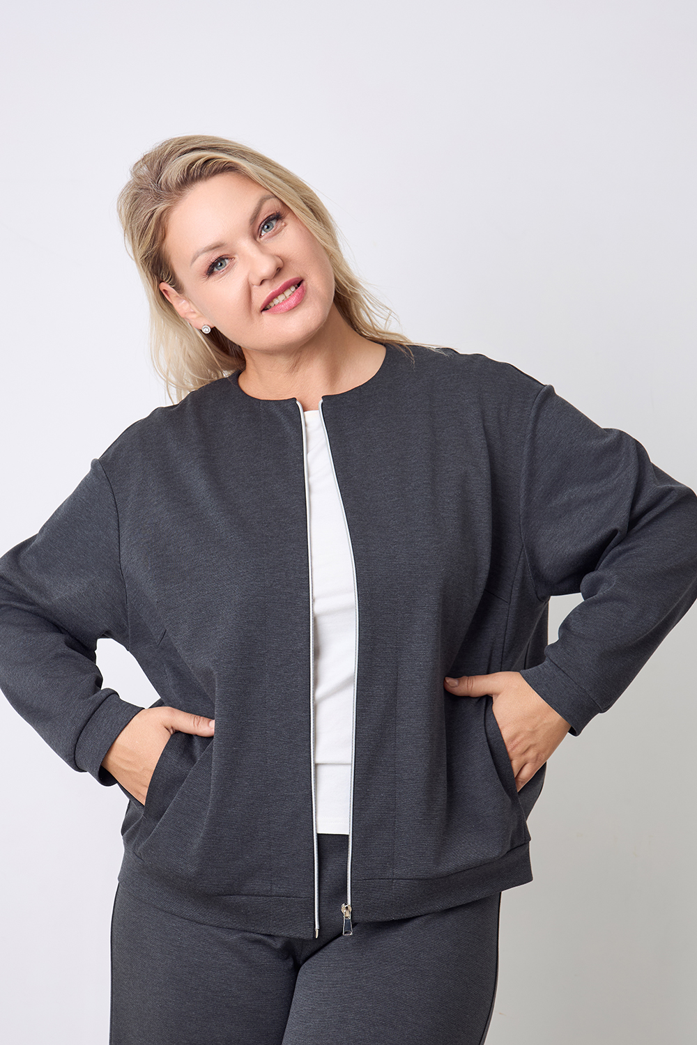Описание: Бомбер из плотного трикотажа "джерси" прямого силуэта имеет два вместительных боковых кармана и застежку на молнии. Длинные втачные рукава с манжетами и пояс по низу изделия выполнены из основной ткани.