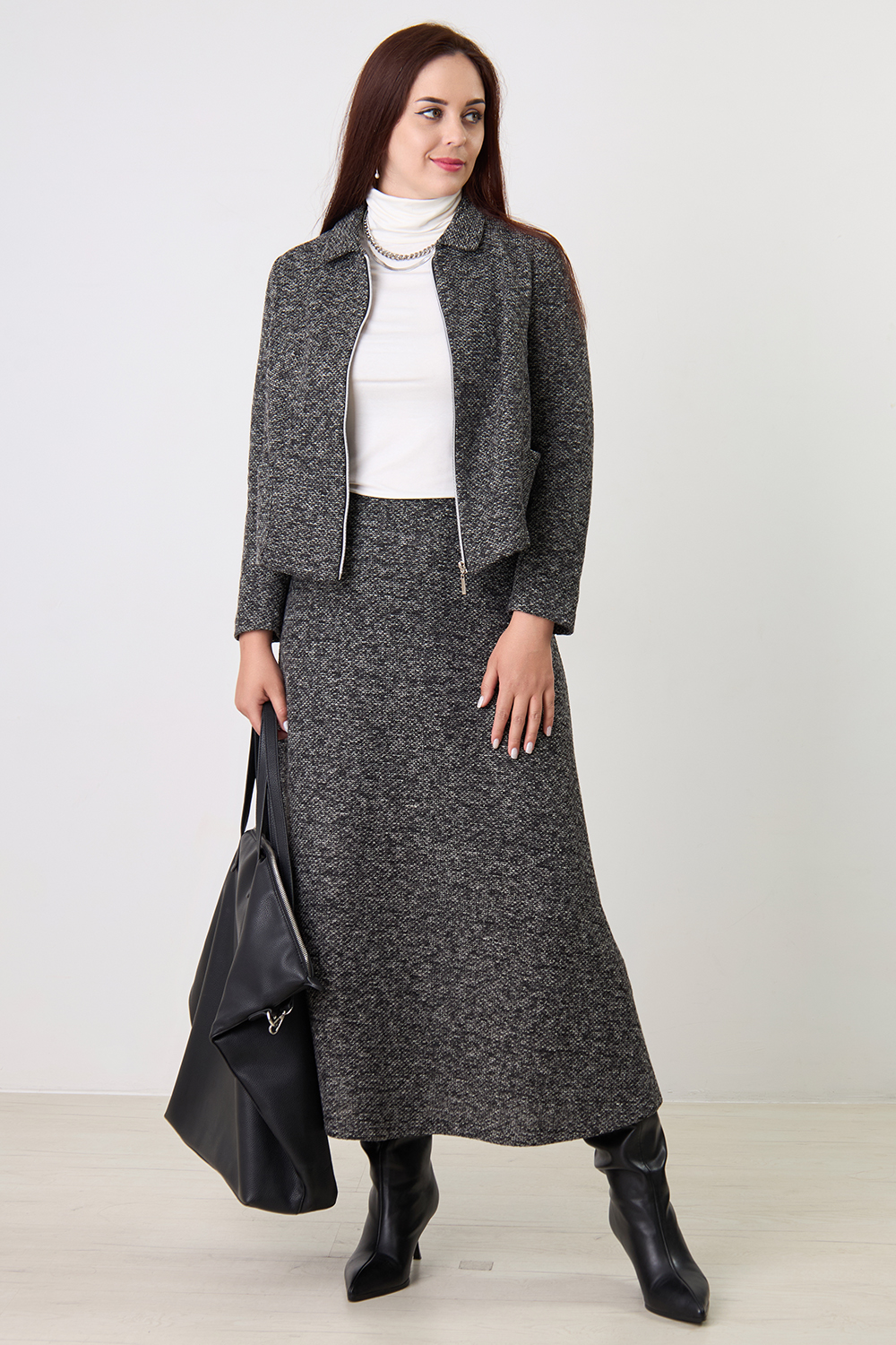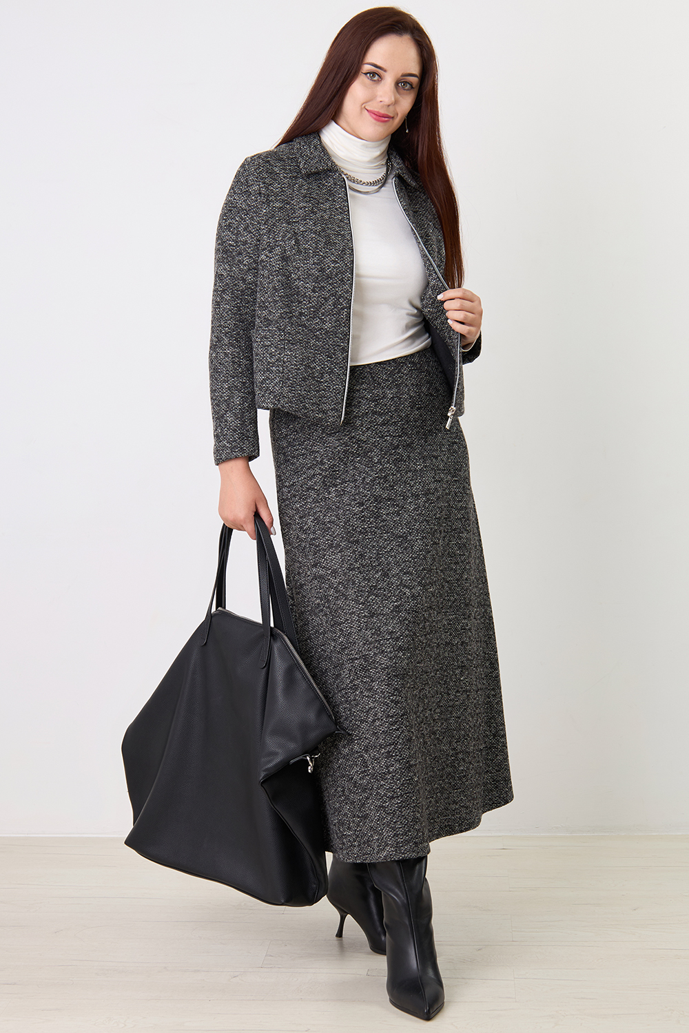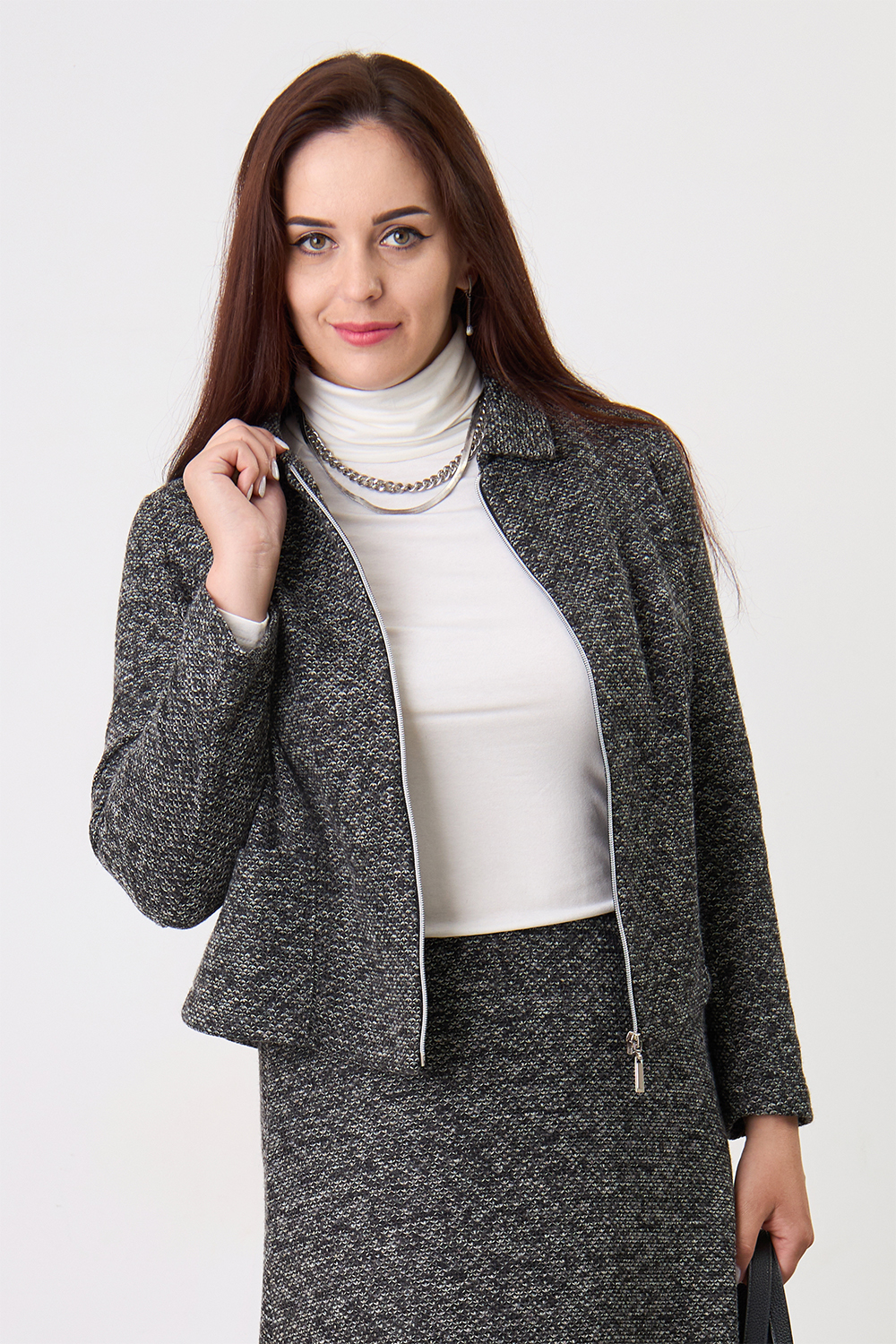 Укороченный жакет прямого силуэта на молнии. Модель слегка расклешенная к низу, имеет стояче-отложной воротник, накладные карманы и длинные двушовные рукава.