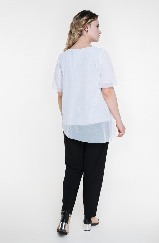Описание: Джемпер удлиненный из трикотажной сетки с подкладкой из тонкого вискозного трикотажа трапецевидного силуэта со скошенной линией низа. Рукава короткие двуслойные из сетки.