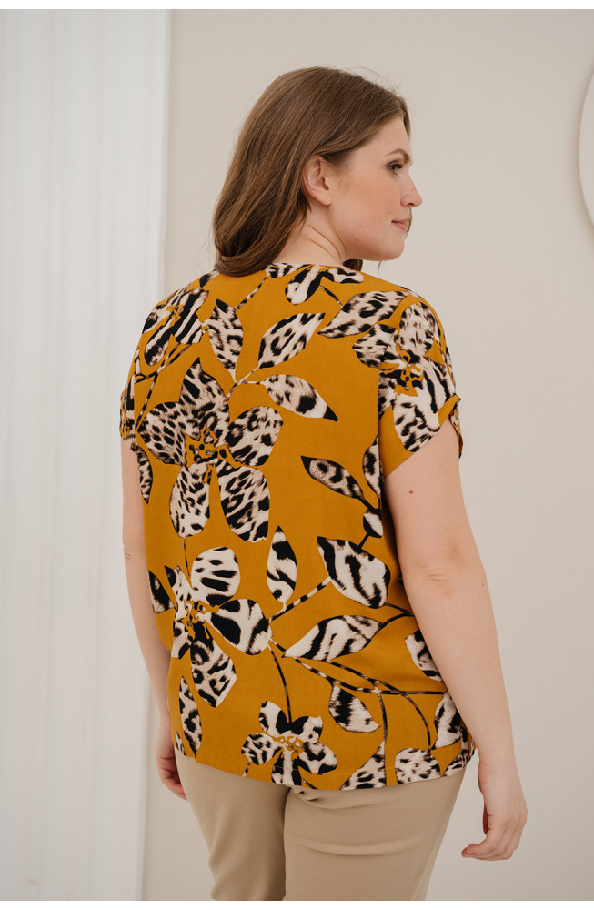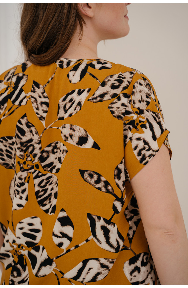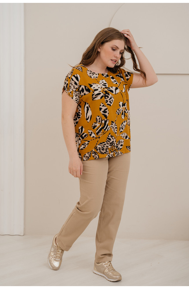 Описание: Джемпер удлиненый прямого силуэта с округлым вырезом горловины и спущенной линией плеча из вискозной ткани "штапель"с абстрактным принтом.