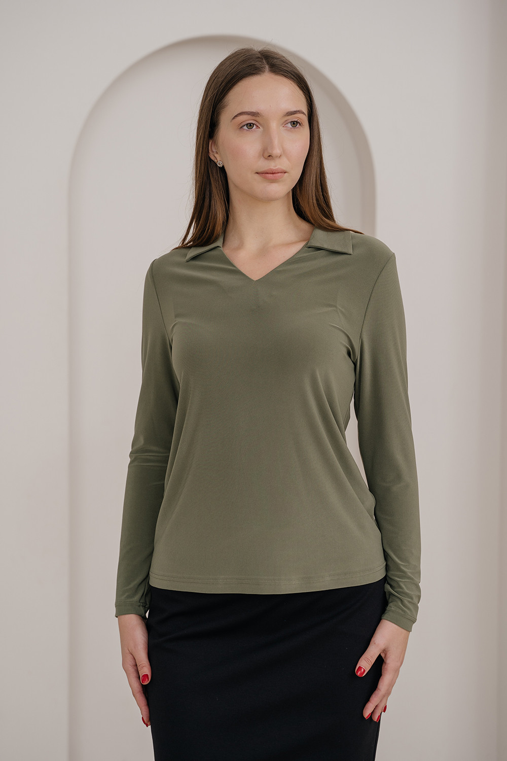 Описание: Джемпер из тонкого трикотажа "масло" полуприлегающего силуэта с воротником на V-образном вырезе горловины и длинными рукавами.