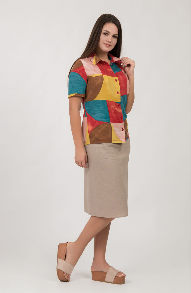 Описание: Блузка-рубашка из вискозной ткани штапель полуприлегающего силуэта на пуговицах с короткими рукавами.