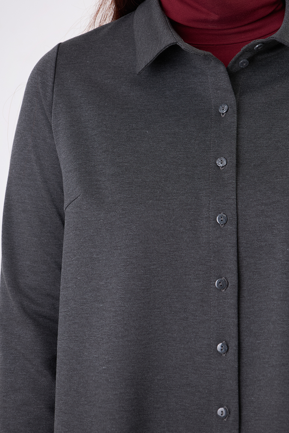 Описание: Блузка удлиненная из плотного трикотажа свободного кроя слегка расклешенная к низу со стояче-отложным воротником. На полочке две нагрудные выточки и центральная застежка на пуговицы. Рукава втачные длинные на манжетах.
