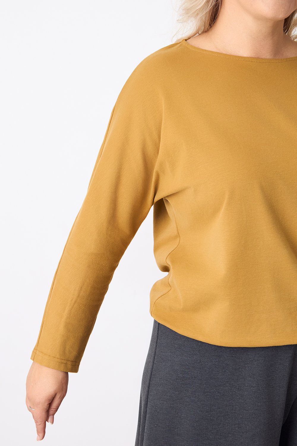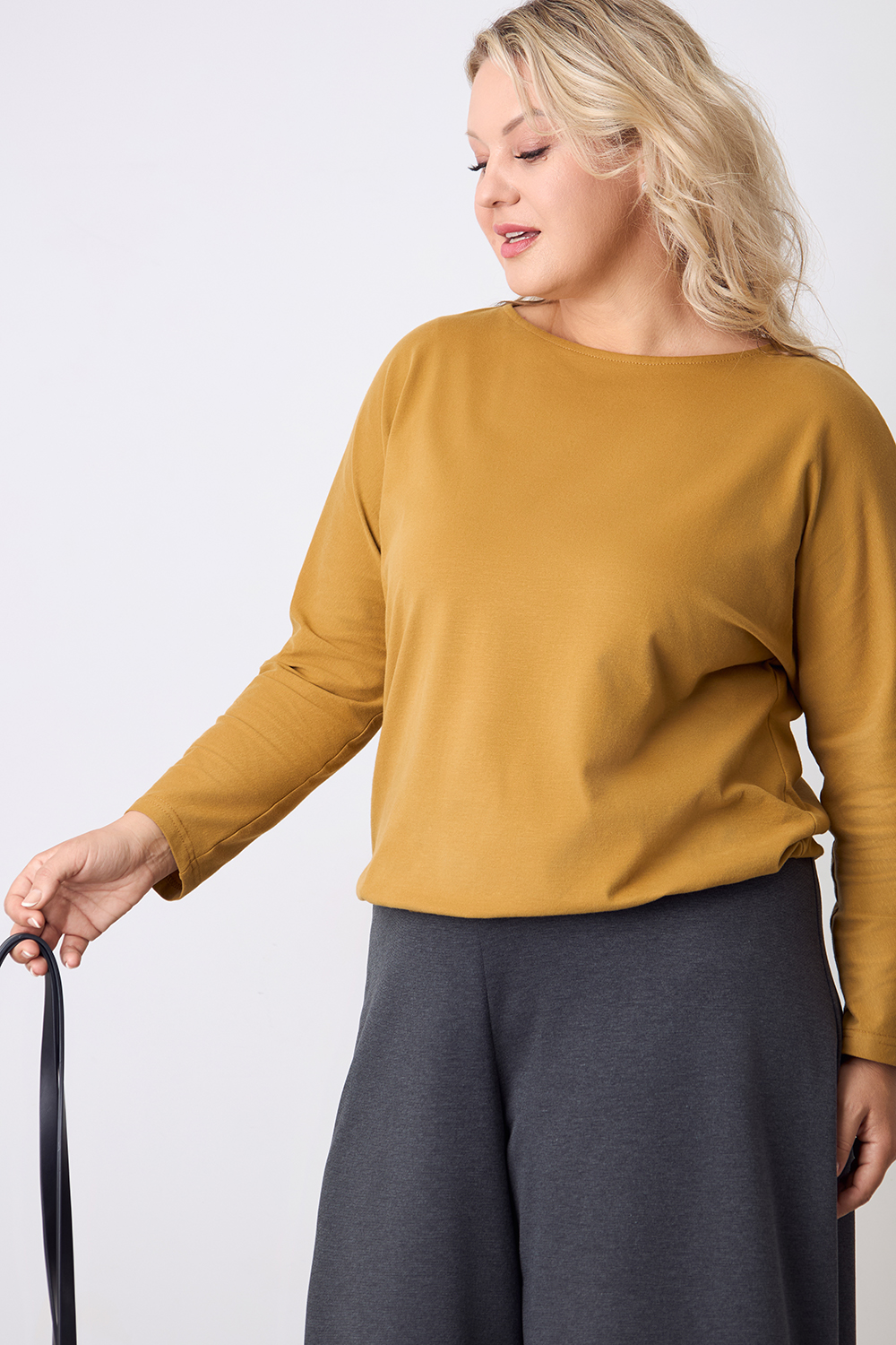 Описание: Джемпер из вискозного трикотажа "фырча" свободного силуэта на резинке по бедрам. Рукава "летучая мышь", вырез горловины "лодочка".