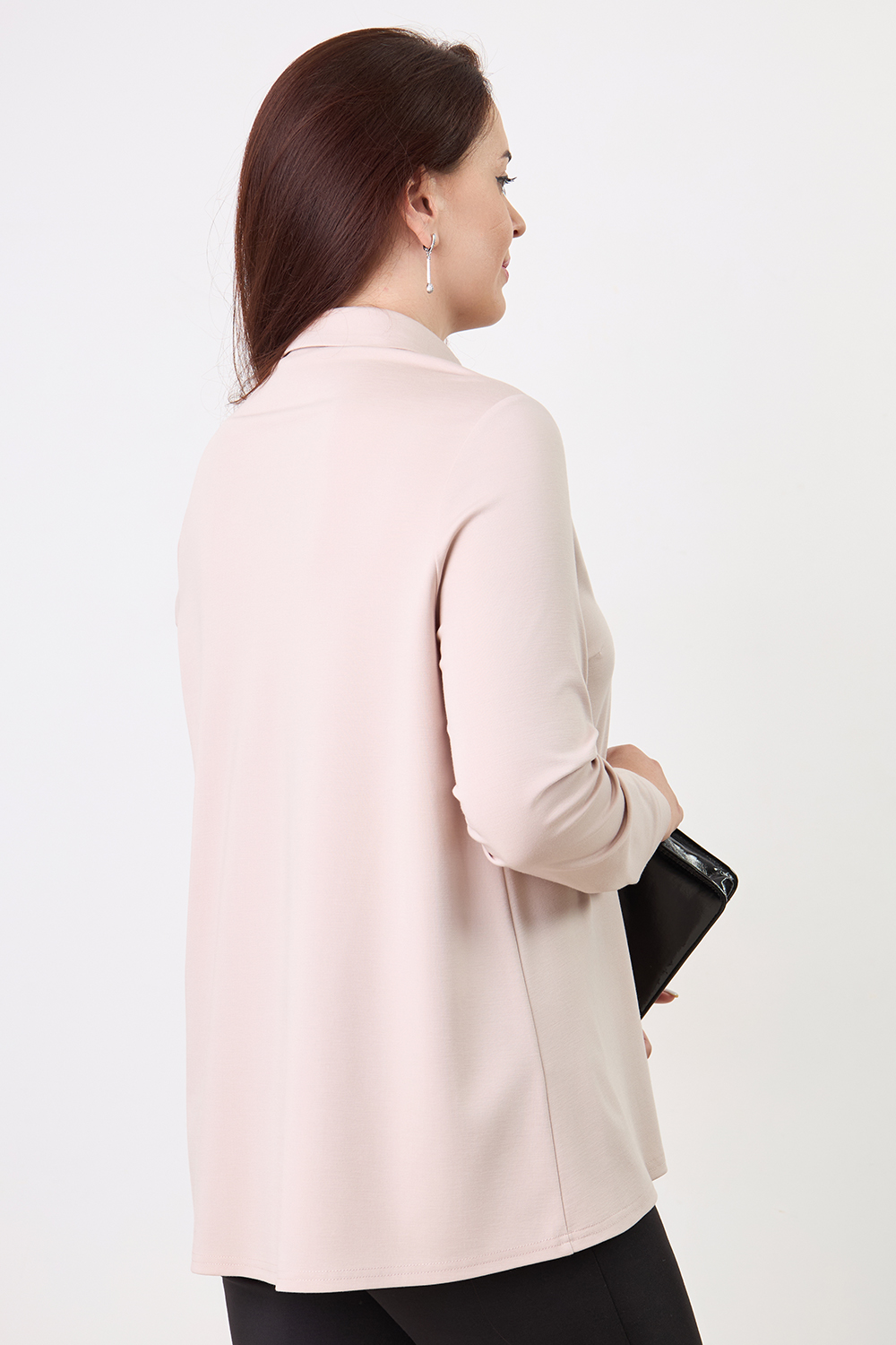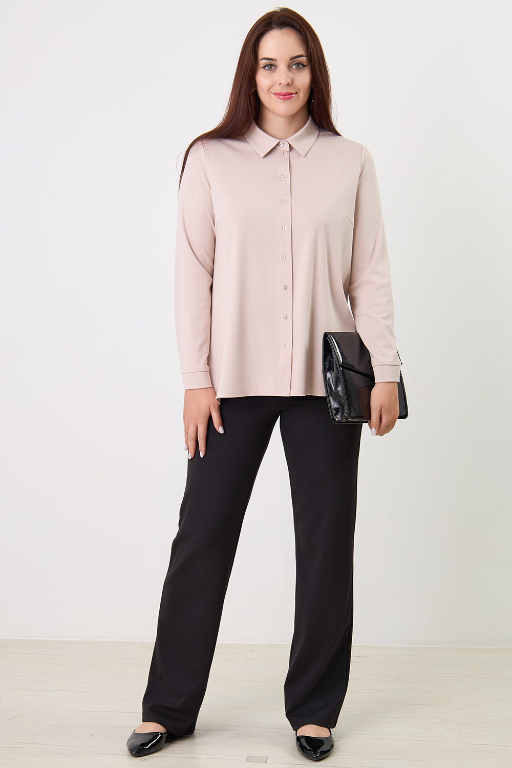 Описание: Блузка удлиненная из плотного трикотажа свободного кроя слегка расклешенная к низу со стояче-отложным воротником. На полочке две нагрудные выточки и центральная застежка на пуговицы. Рукава втачные длинные на манжетах.