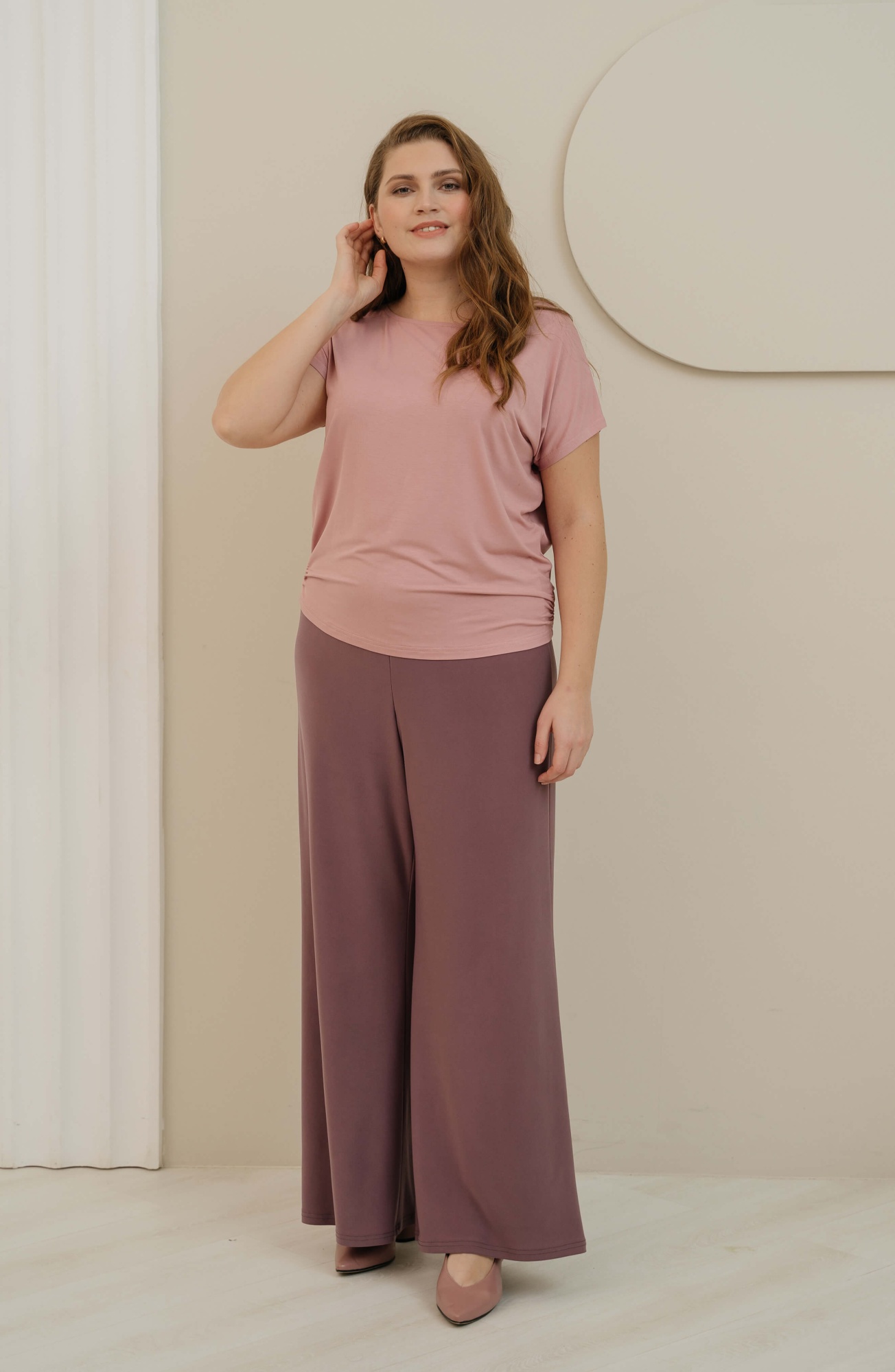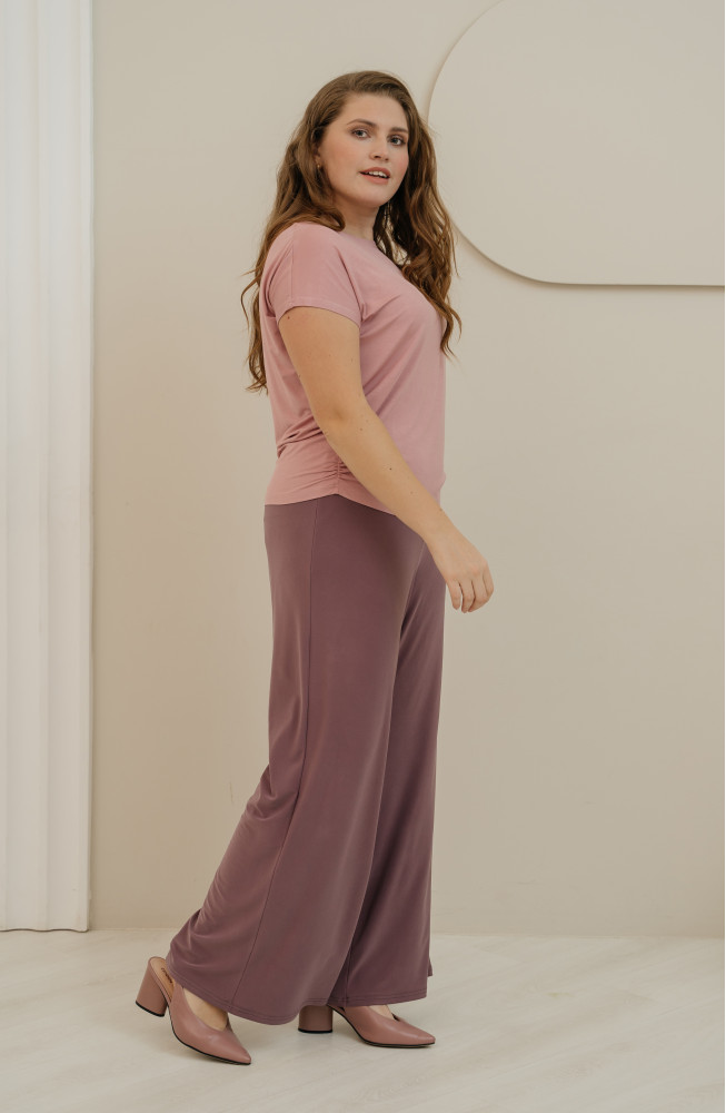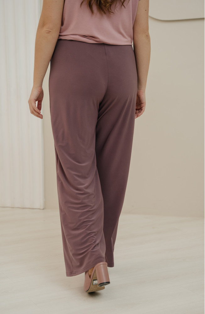 Брюки типа палаццо выглядят женственно и красиво драпируются. Высокая посадка надежно фиксирует изделие на талии. Скользящая, приятная к телу фактура полотна и широкий крой брюк обеспечивают хорошую вентиляцию при движении, и поэтому в жаркую погоду в брюках комфортно.