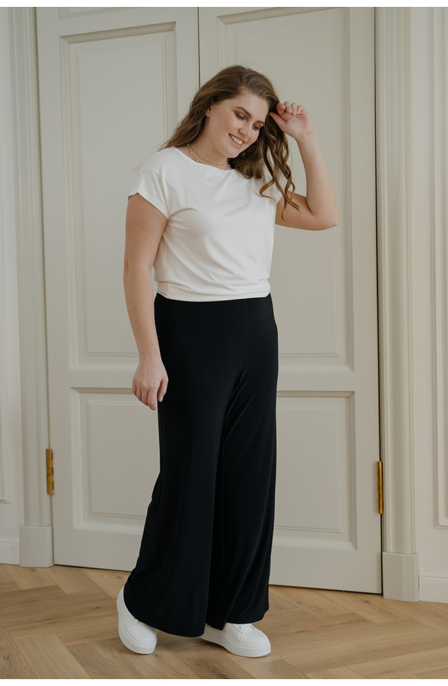 Брюки типа палаццо выглядят женственно и красиво драпируются. Высокая посадка надежно фиксирует изделие на талии. Скользящая, приятная к телу фактура полотна и широкий крой брюк обеспечивают хорошую вентиляцию при движении, и поэтому в жаркую погоду в брюках комфортно.