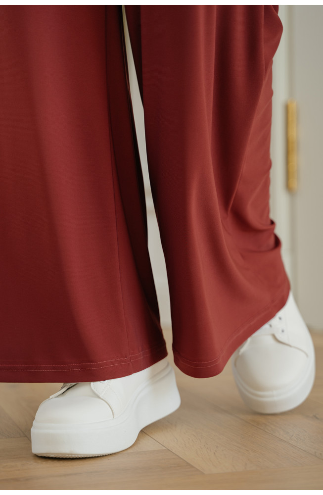 Брюки типа палаццо выглядят женственно и красиво драпируются. Высокая посадка надежно фиксирует изделие на талии. Скользящая, приятная к телу фактура полотна и широкий крой брюк обеспечивают хорошую вентиляцию при движении, и поэтому в жаркую погоду в брюках комфортно.