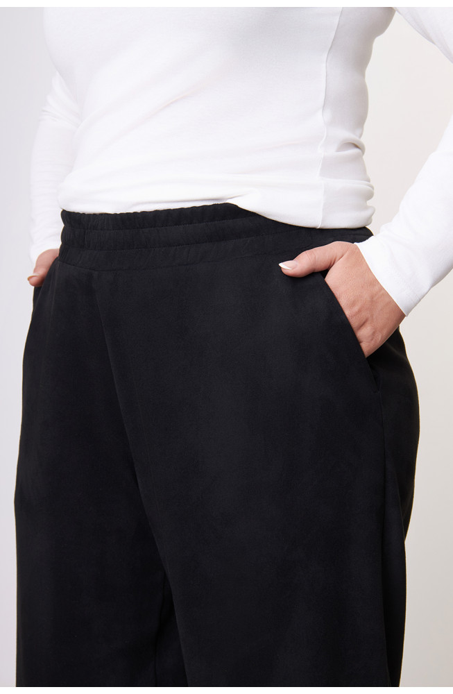 Описание: Брюки женские из замши имеют форму бананов, слегка зауженные к низу и свободные на бедрах, благодаря чему прекрасно содятся на широкие бедра и делают фигуру более стройнее.