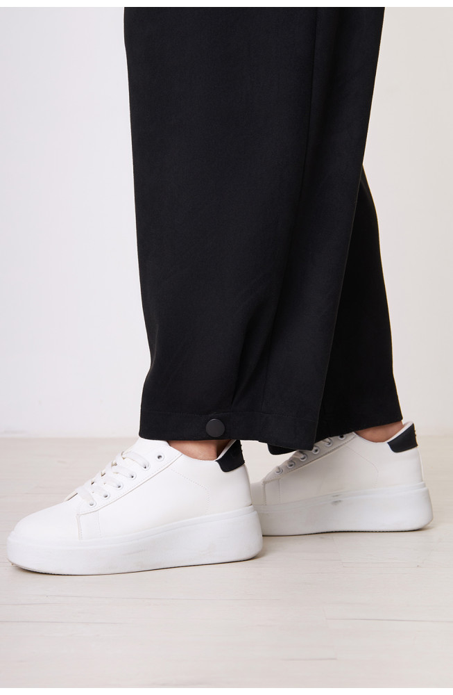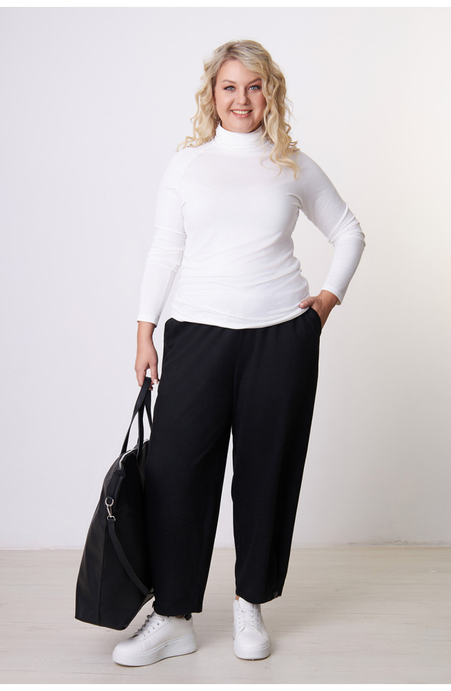 Брюки не имеют застежку, талия фиксируется притачным поясом с эластичной резинкой.