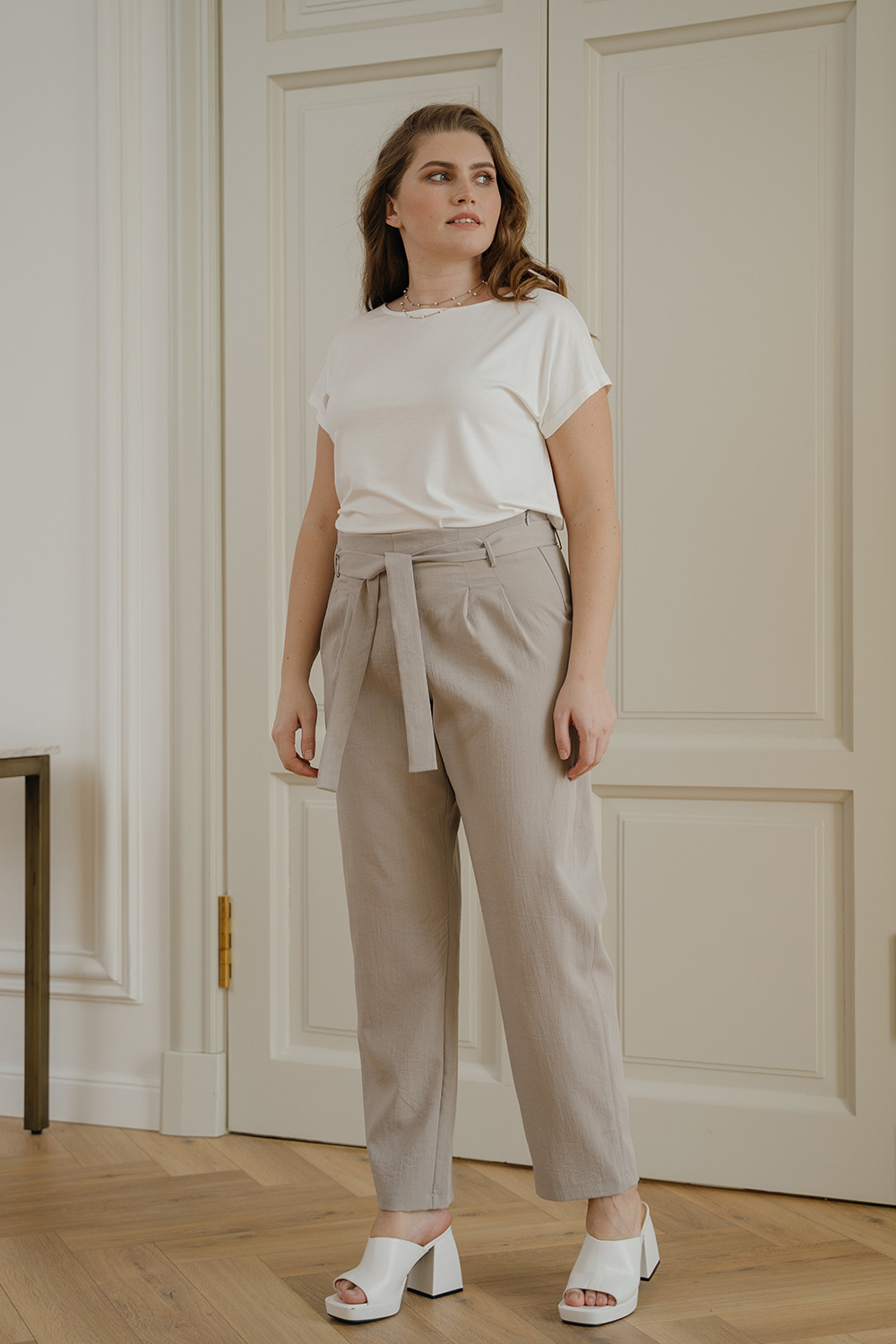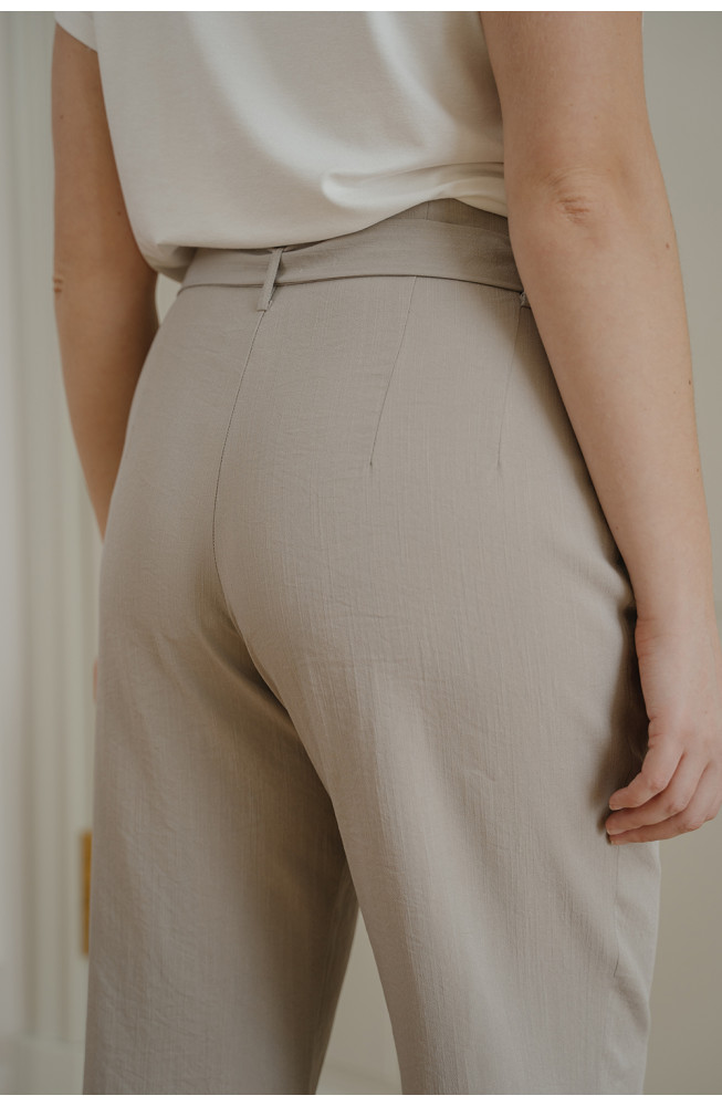 Описание: Брюки-"бананы" из костюмной ткани с жатым эффектом с завышенной талией на поясе-кушаке со складками от талии и застежкой-молнией сбоку.