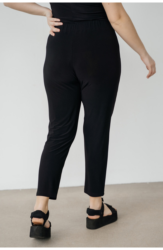 Описание: Брюки из тонкого трикотажа зауженные к низу с защипами от пояса, без застежки на резинке по талии с карманами по бокам.