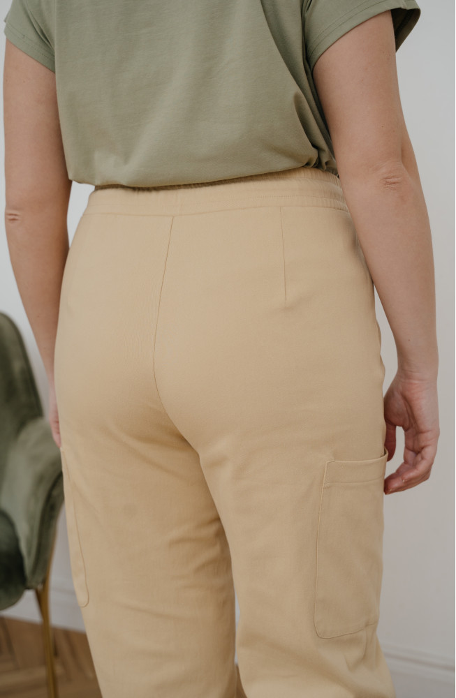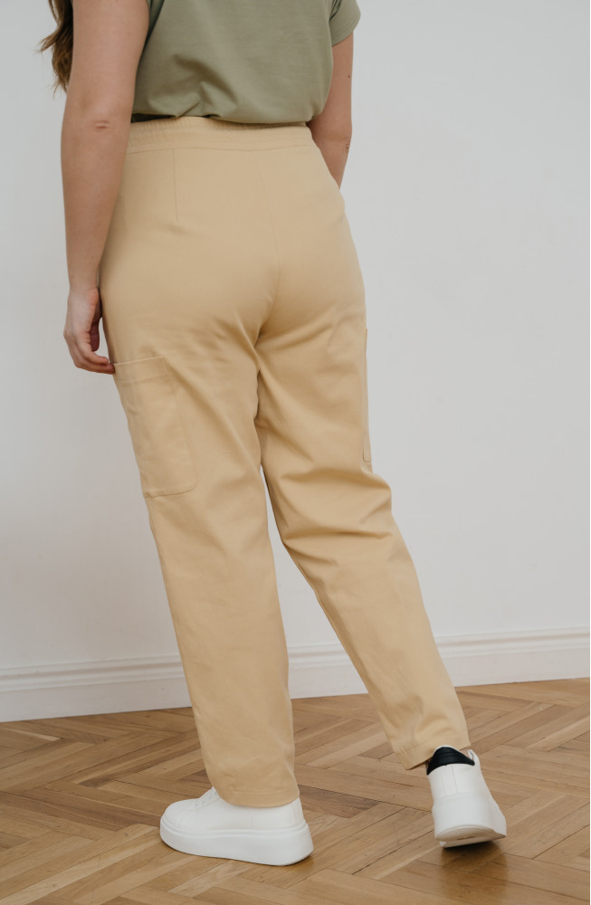 Описание: Брюки-"бананы" из плотного костюмного хлопка с плотной посадкой по талии со свободой по бедру и с заужением к низу за счет вытачек, на поясе с резинкой и шнурком без застежки, "джинсовыми" карманами спереди и накладными карманами по бокам над линией колена.