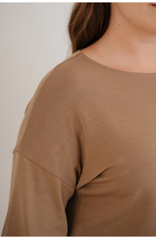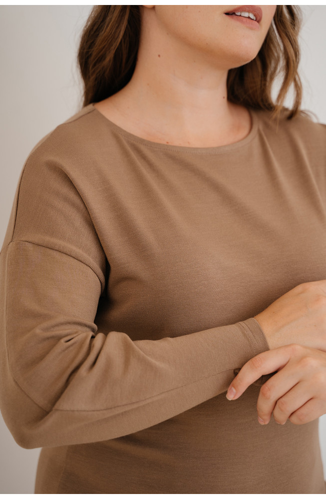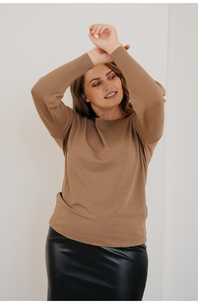 Описание: Джемпер из вязаного трикотажа прямого силуэта с рукавами расширенными сверху и зауженными по запястью. Вырез горловины "лодочка", линия плеча спущена.