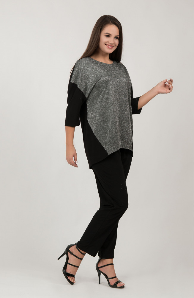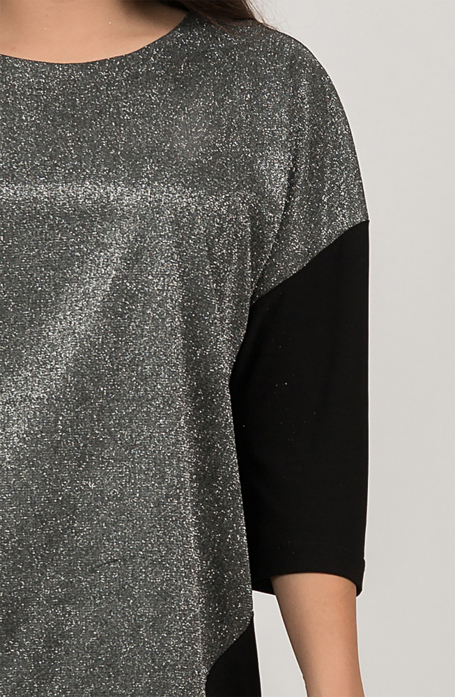 Описание: Джемпер удлиненный из сочетания блестящего трикотажа и тонкого трикотажа "масло" силуэта oversize. Передняя часть джемпера выполнена из блестящего трикотажа, спинка и рукава из однотонного трикотажа.Низ изделия разнодлинный.