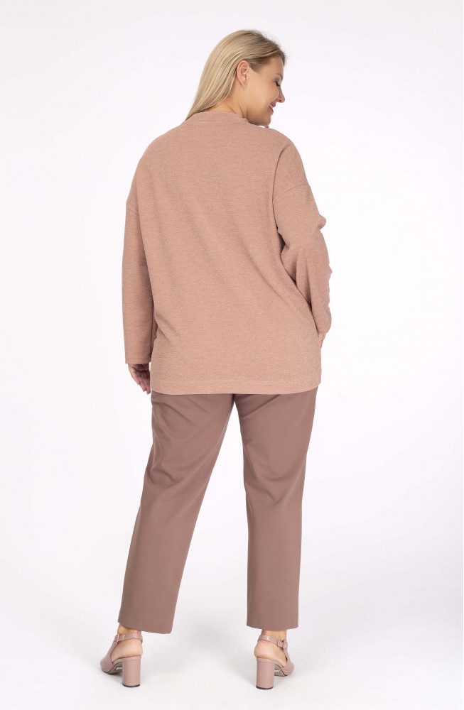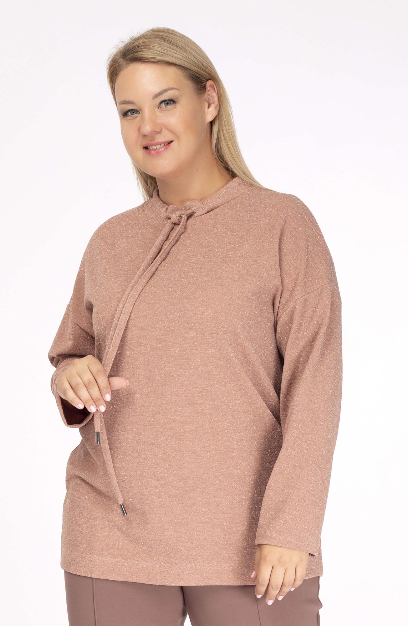Описание: Джемпер удлиненный из плотного трикотажа с люрексом силуэта oversize с воротником-стойкой с кулисой и шнурком и длинными рукавами на спущенной линии плеча.