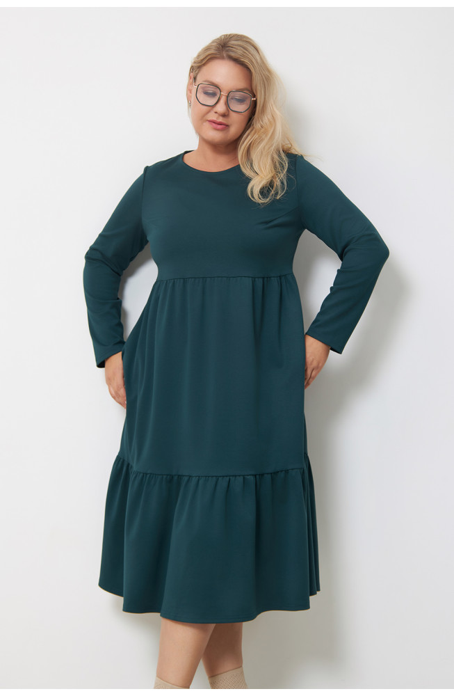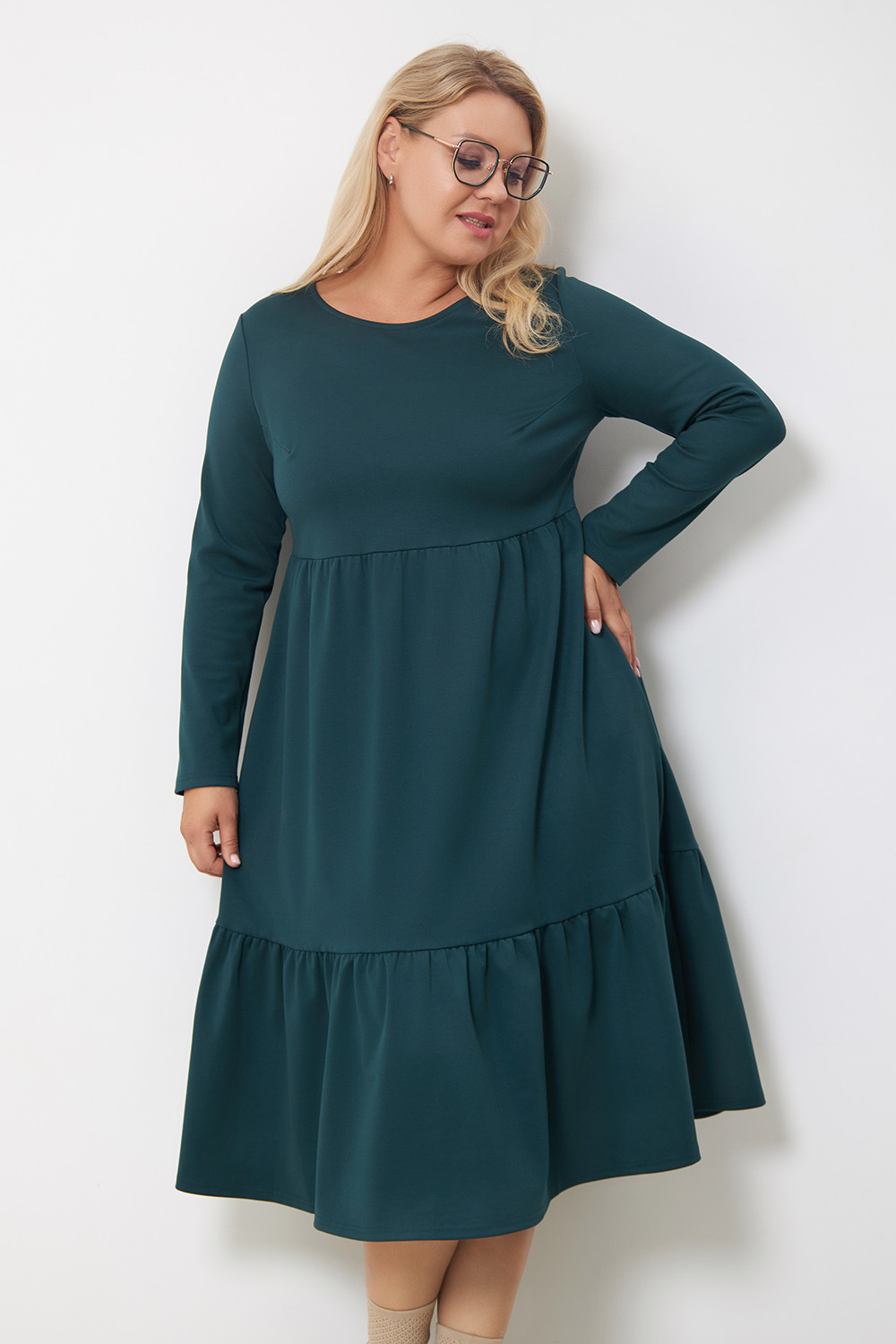 Описание: Платье из плотного трикотажа джерси трапецевидного силуэта с подрезом под грудью, длинными рукавами и нижней частью, состоящей из двух ярусов со сборками.