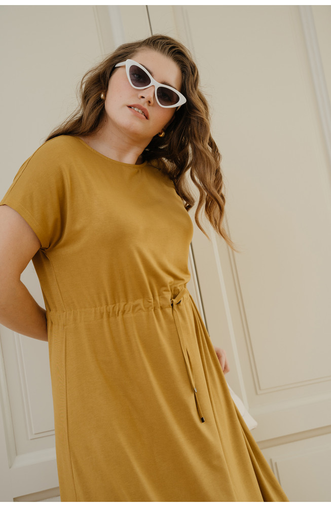 Платье женское из тонкого вискозного трикотажа с лайкрой, свободного кроя, полуприлегающего силуэта, на кулисе со шнурком и люверсами по талии, слегка расклешенное к низу, вырез горловины округлый, плечо приспущено. Натуральный материал ярких цветов относит платье к категории экологичных и нарядных вещей.
