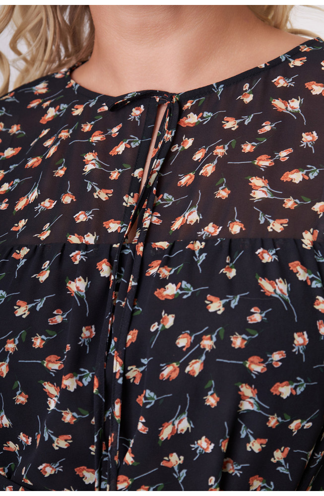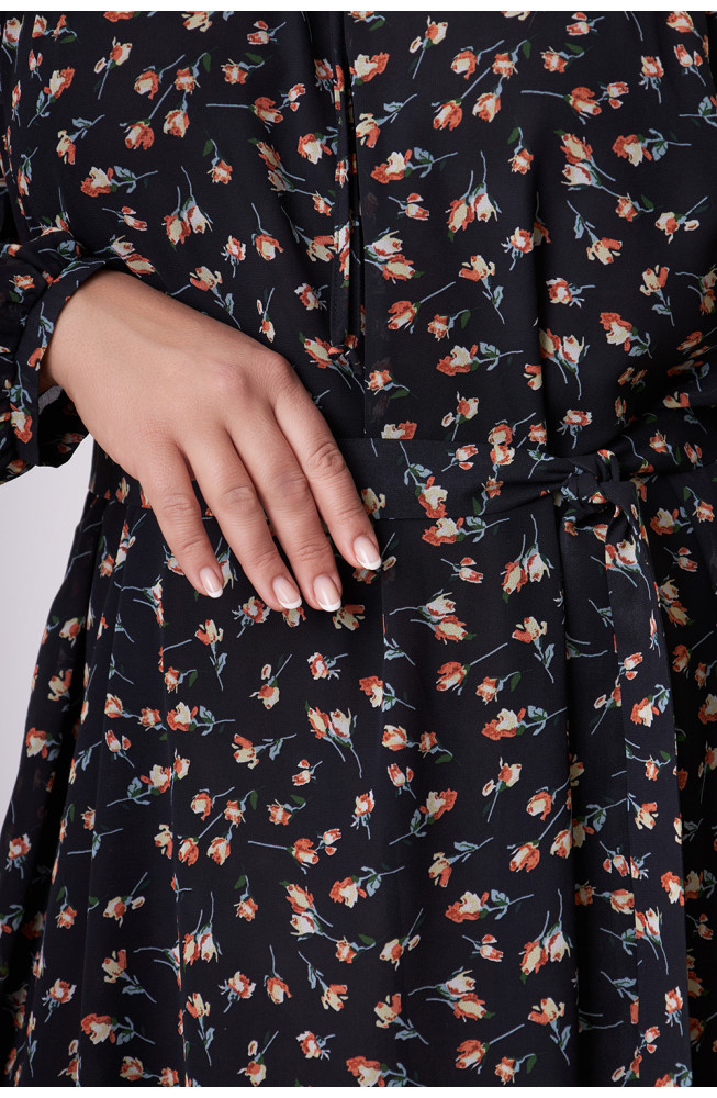 Модель А-силуэта с округлым вырезом горловины переходящим в форму капельки на завязках. Длинные рукава присборенные на окантовку по низу. Платье красиво выравнивает все контуры силуэта. Можно носить как с поясом, так и без него.