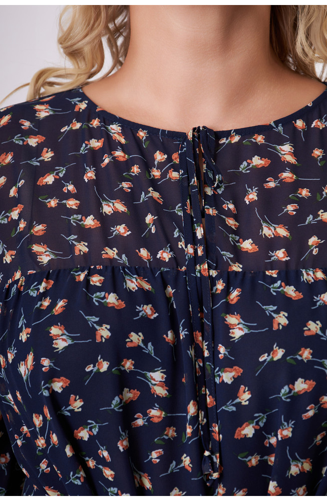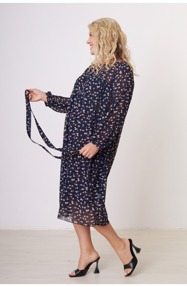Модель А-силуэта с округлым вырезом горловины переходящим в форму капельки на завязках. Длинные рукава присборенные на окантовку по низу. Платье красиво выравнивает все контуры силуэта. Можно носить как с поясом, так и без него.