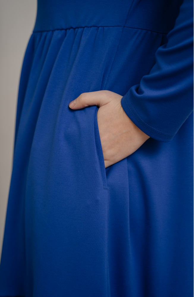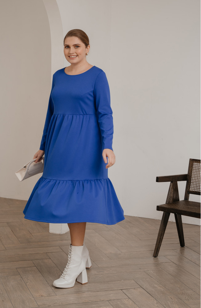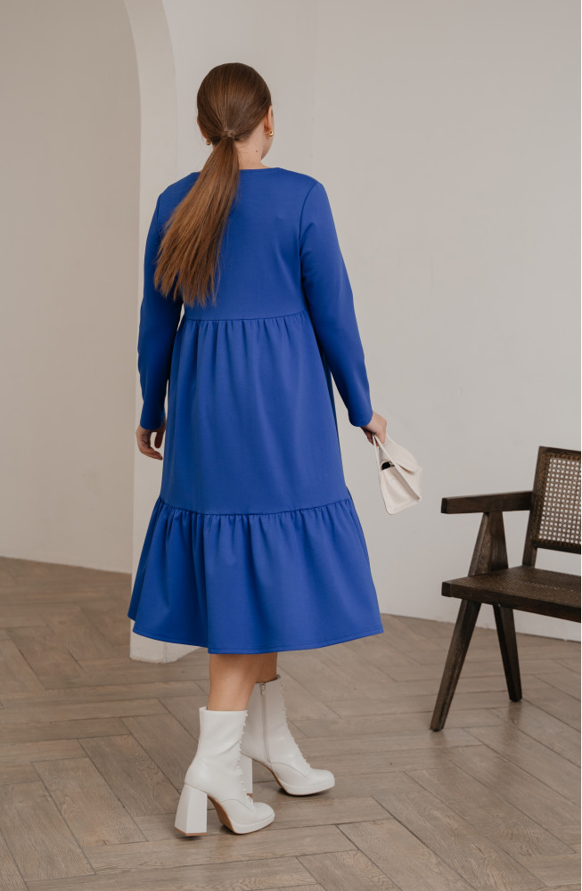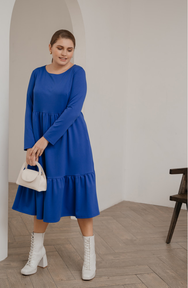 Описание: Трикотажное платье, из джерси, платье  А-силуэта, платье ярусное, с подрезом под грудью, и нижней частью, состоящей из двух ярусов со сборками, платье с длинными рукавами, платье миди, платье  васильковое.