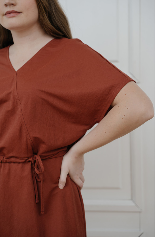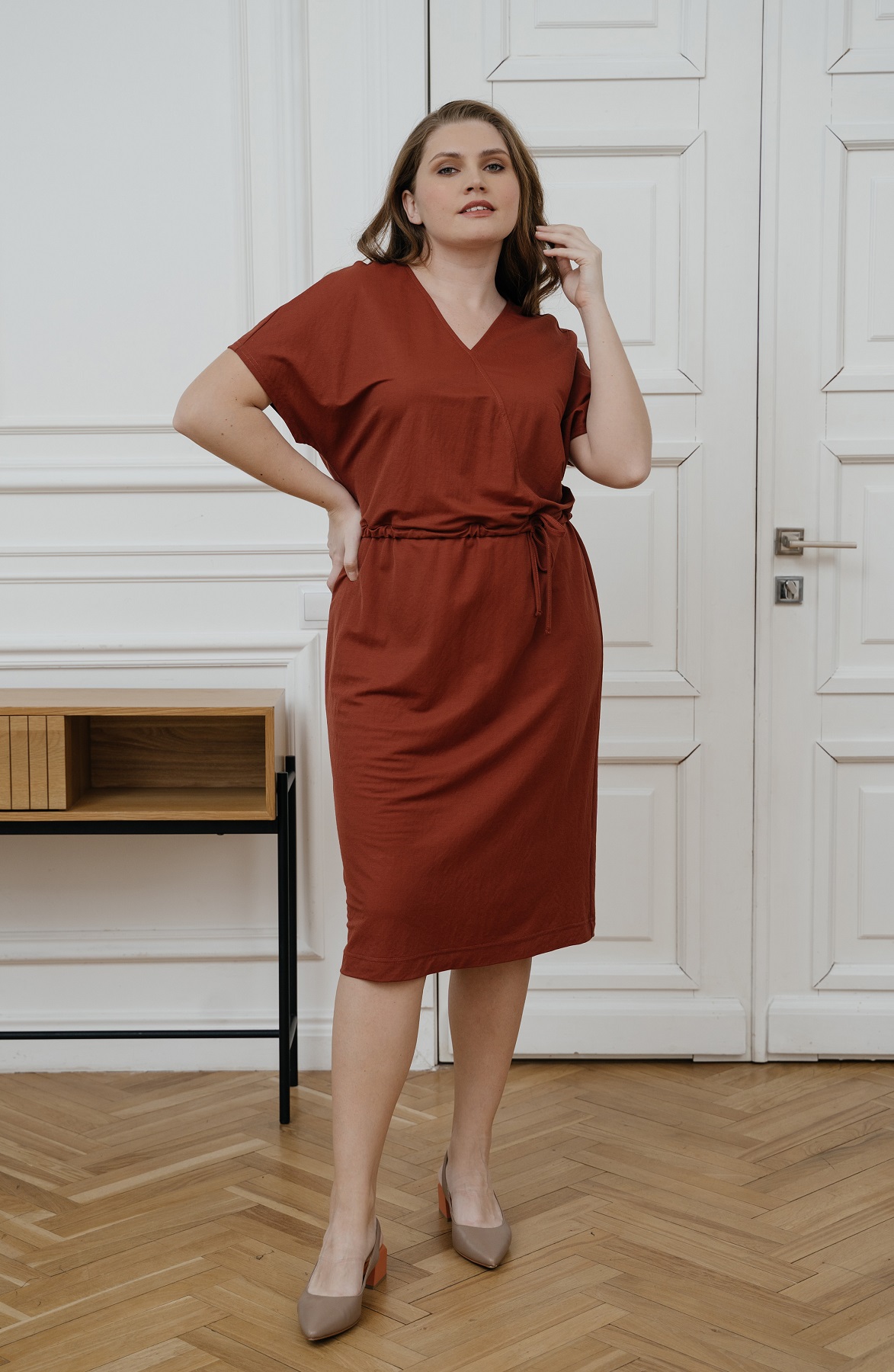Описание: Платье из тонкого трикотажа свободного силуэта в верхней части и прямое в нижней части, с V-образным вырезом горловины с имитацией запаха, со спущенным плечом без рукавов и на кулиске с завзкой по талии.