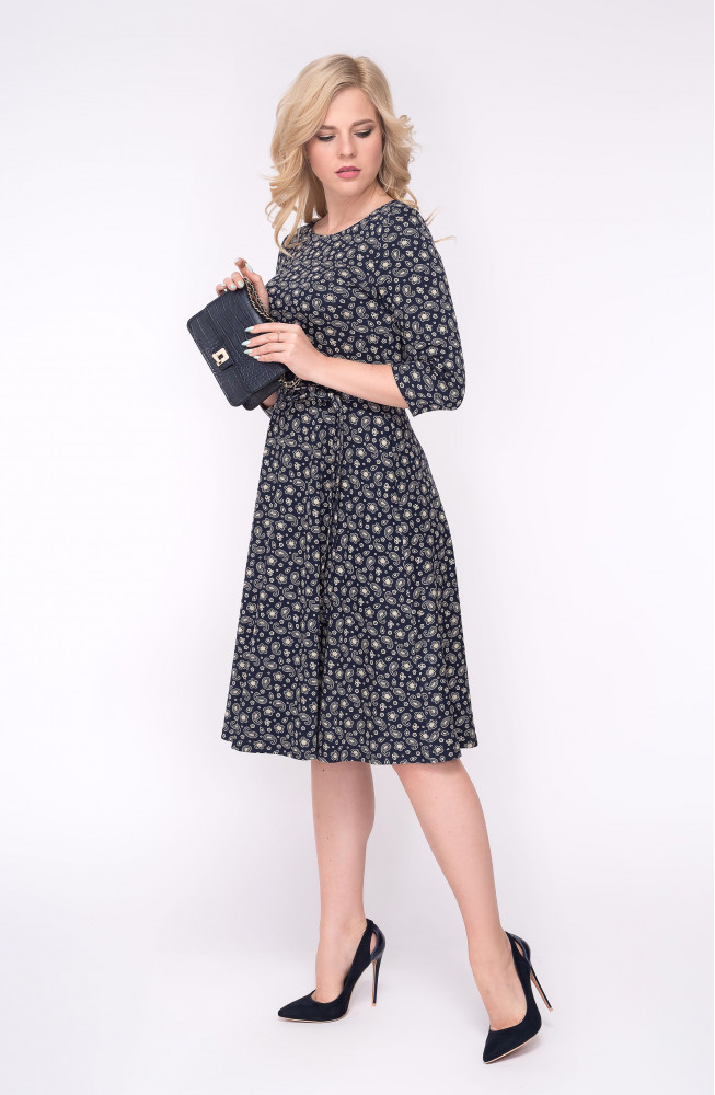 Описание: Платье приталенного с расклешённой нижней частью, рукавами 3/4, вырезом горловины "лодочка" и поясомкушаком на талии. Платье подойдёт женщине любого типа фигуры, скроет лишние сантиметры, сформирует женственную, пропорциональную фигуру.
