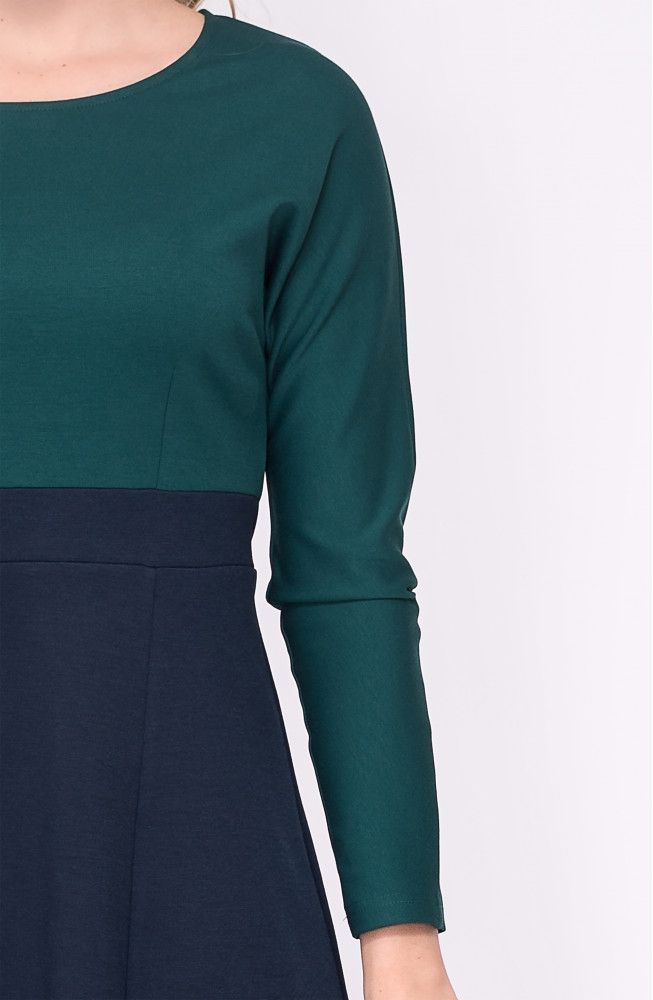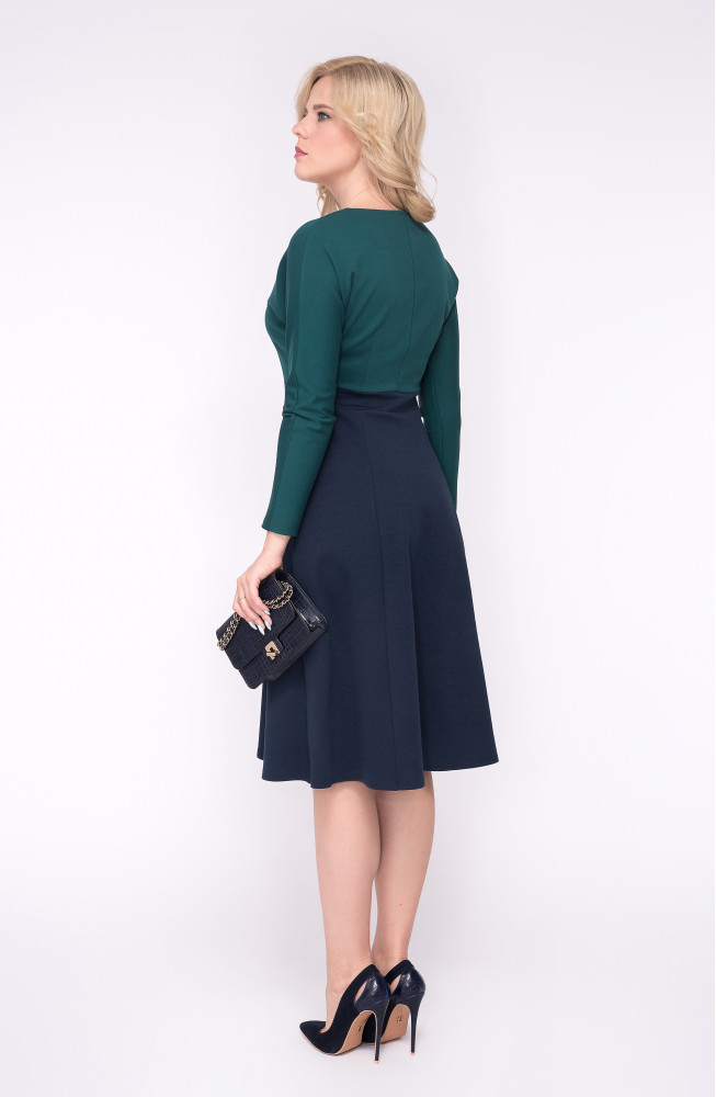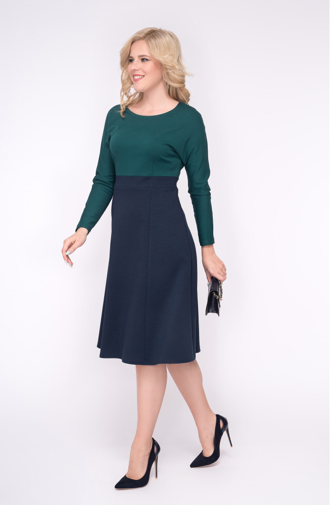 Описание: Платье из плотного трикотажа джерси полуприлегающего силуэта с округлым вырезом горловины, с цельнокроенными рукавами длиной 7/8 и расклешенной юбкой 6-клинкой на поясе по талии. Верхняя часть платья и нижняя - юбка на поясе, выполнены из трикотажа разных цветов.