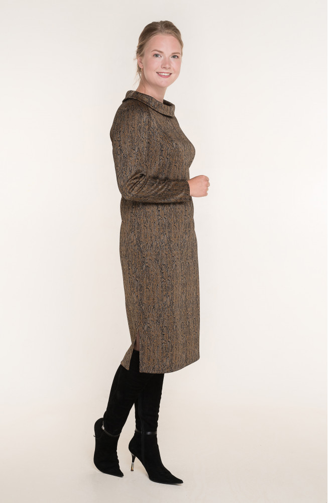 Описание: Платье из плотного трикотажа полуприлегающего силуэта с воротником "хомут" и длинными рукавами-реглан. Внизу по бокам есть разрезы.