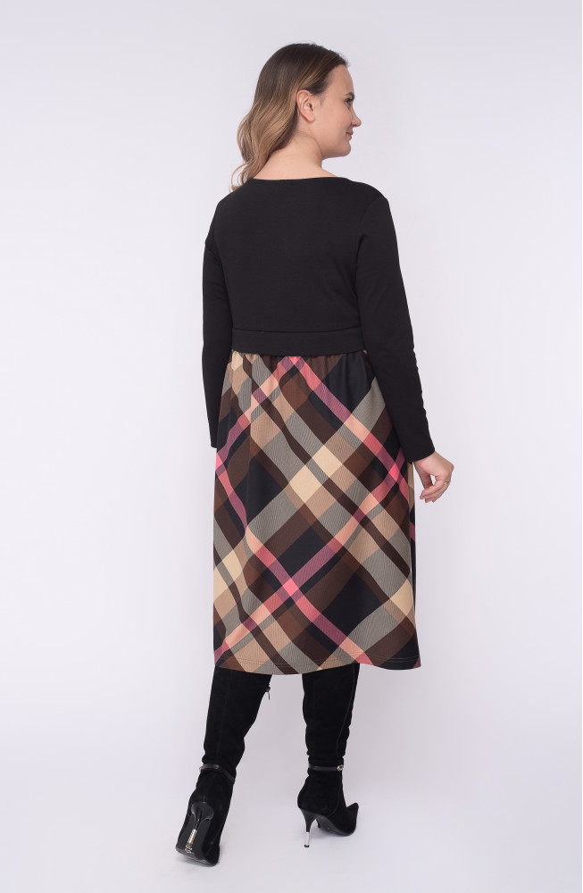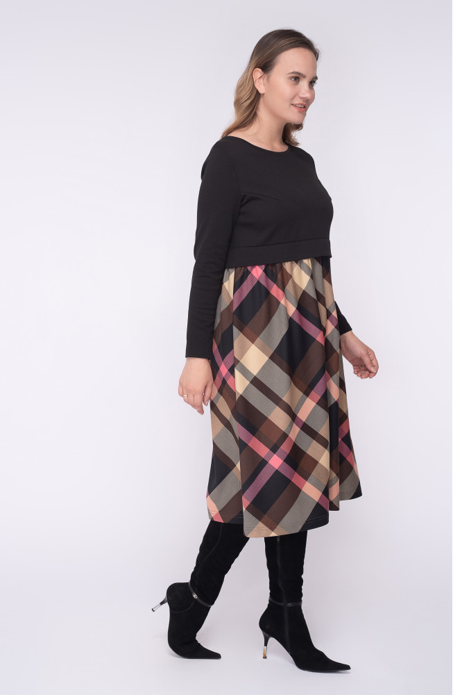 Описание: Платье из плотного трикотажа джерси полуприлегающего силуэта с подрезом по талии с втачным поясом-планкой. Нижняя часть платья со сборкой по талии из принтованного трикотажа, верхняя часть платья однотонная.