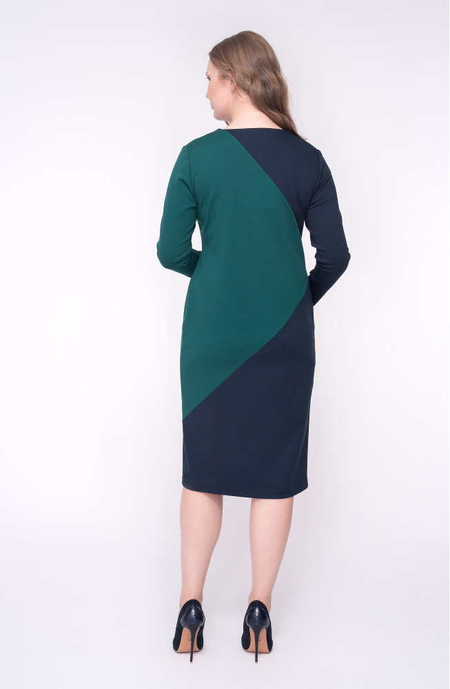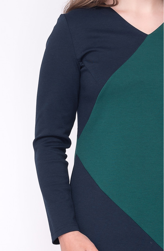 Описание: Платье из плотного трикотажа джерси в сочетании двух цветов с имитацией запаха, прямого силуэта с V-образным вырезом горловины и длинными рукавами.
