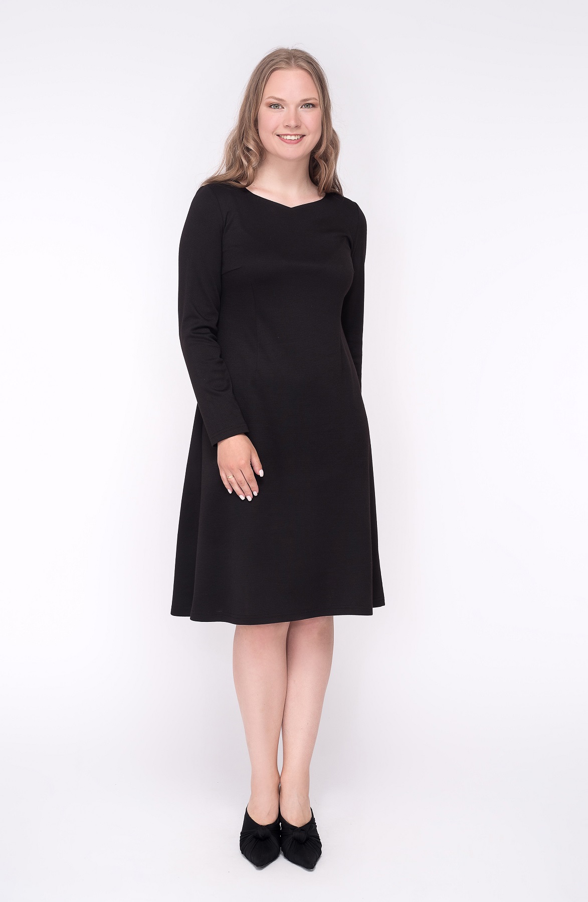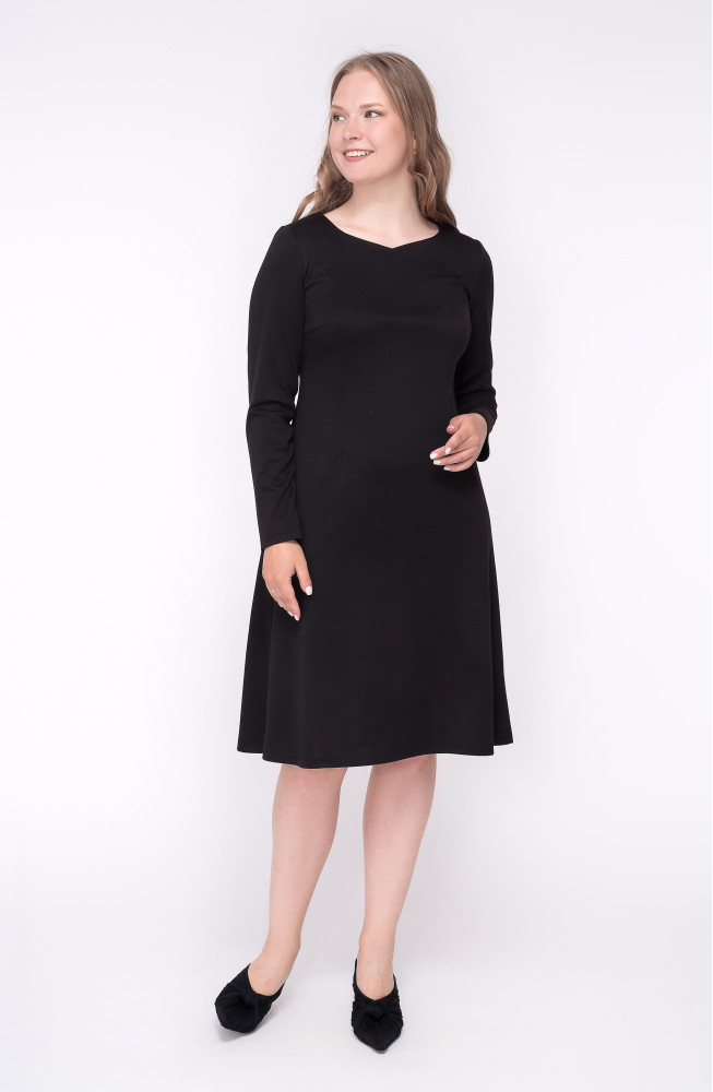 Описание: Платье из плотного трикотажа полуприлегающего силуэта расклешеное к низу с фигурным вырезом горловины и длинными рукавами.