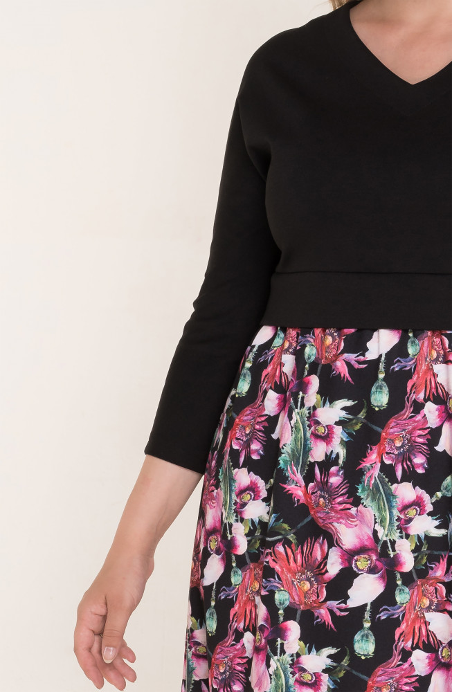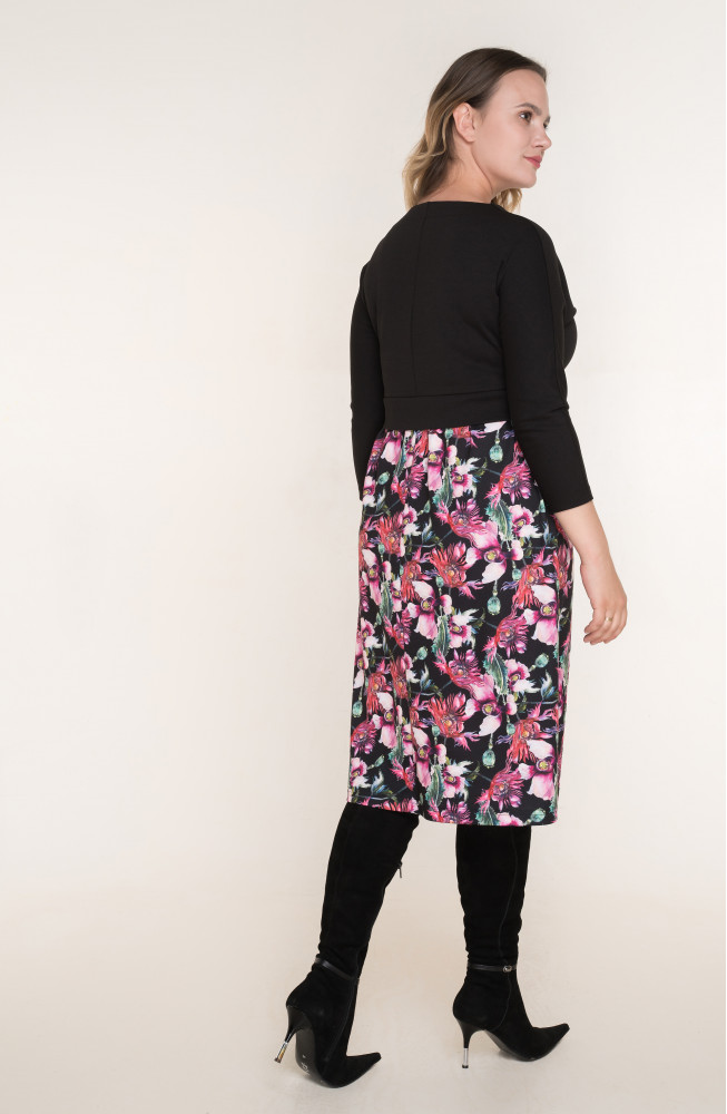 Описание: Платье из плотного трикотажа джерси полуприлегающего силуэта с подрезом по талии с втачным поясом-планкой, цельнокроенными рукавами и V-образным вырезом горловины. Нижняя часть платья со сборкой по талии из принтованного трикотажа, верхняя часть платья однотонная.