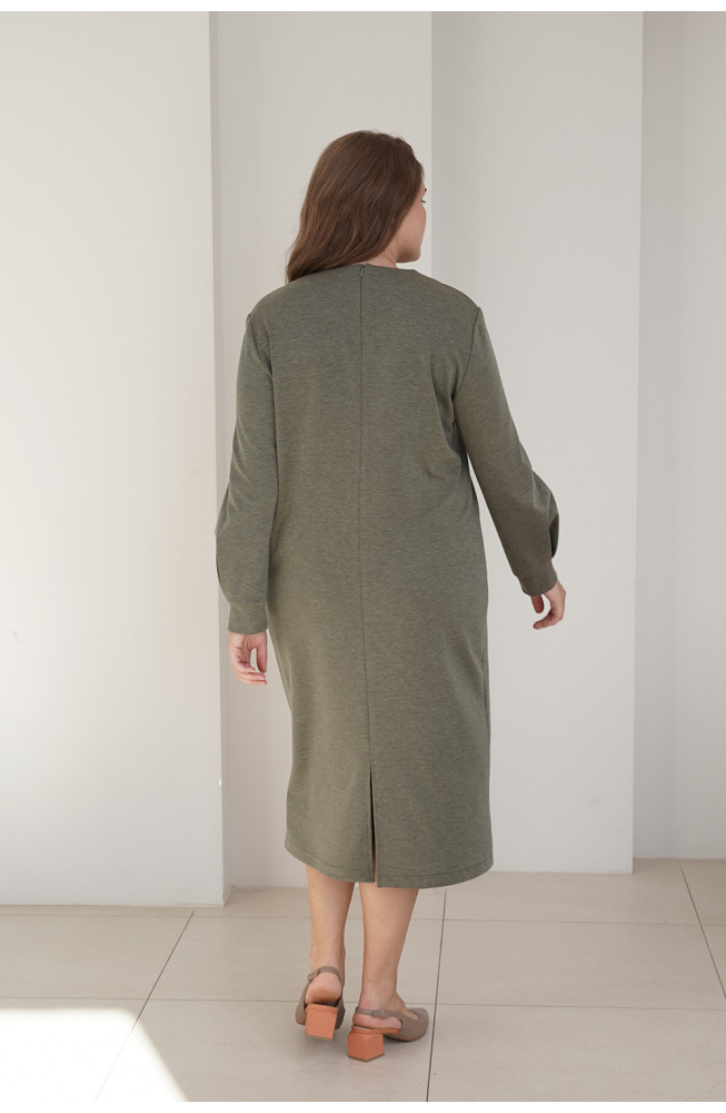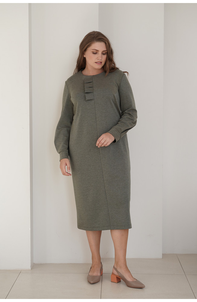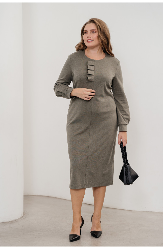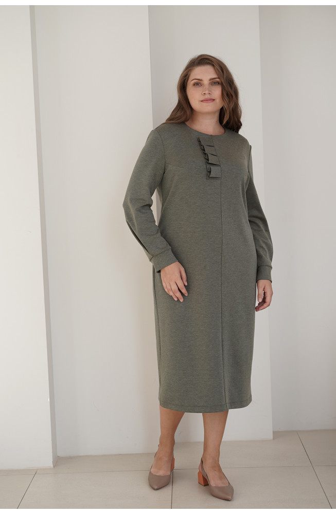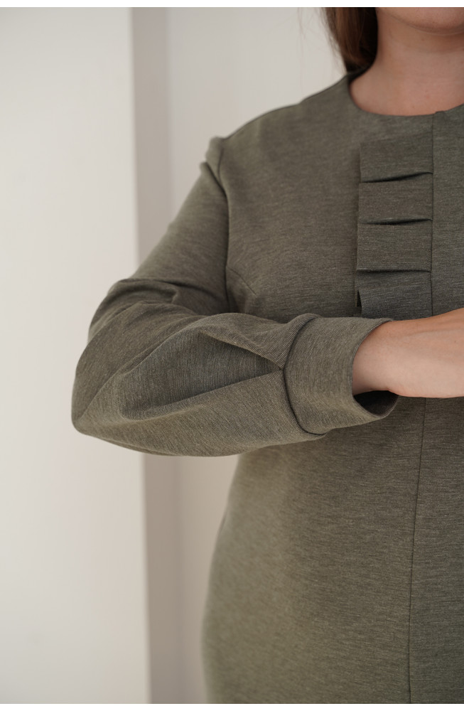 Описание: Платье из плотного трикотажа джерси полуприлегающего силуэта с декоративной рюшей со складками по груди, с длинными рукавами на манжетах и с округлым вырезом горловины. Платье длиной до середины голени.