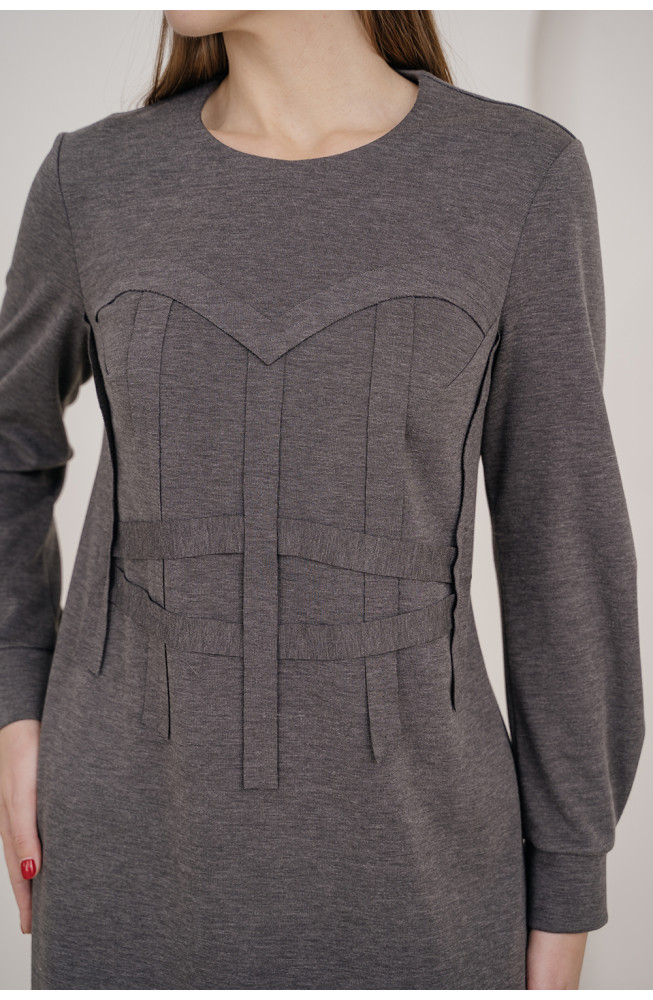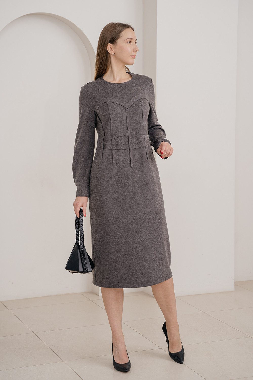 Описание: Платье из плотного трикотажа джерси полуприлегающего силуэта с длинными рукавами на манжетах, с округлым вырезом горловины и с декоративной имитацией корсета спереди в виде пришитых лент из трикотажа. Платье длиной до середины голени.